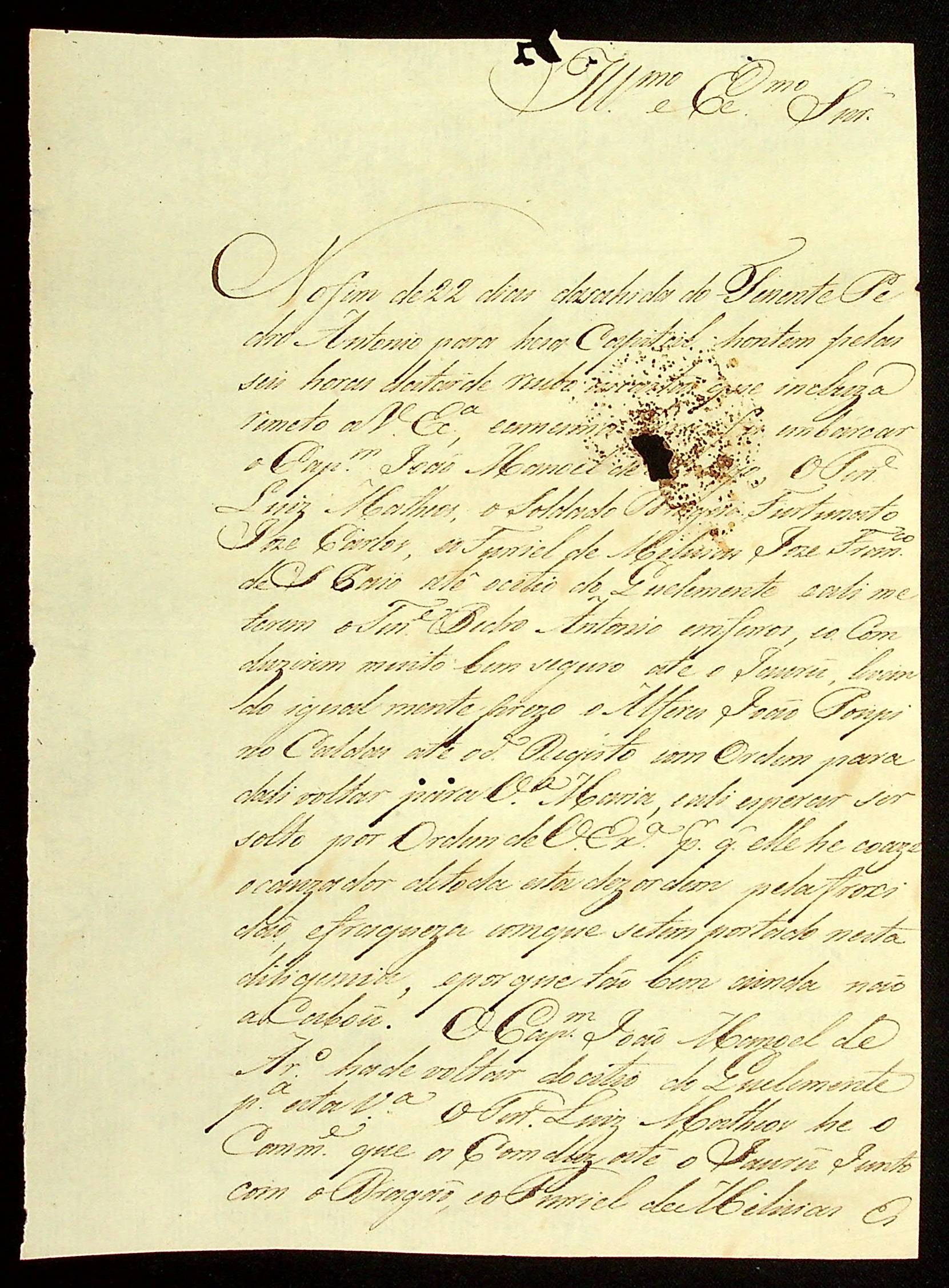 CARTA do [Sargento-mor Ajudante de Ordens] Alexandre José Leite de Chaves Melo ao [Governador e Capitão-General da Capitania de Mato Grosso] João Carlos Augusto d’Oeynhausen e Gravenberg.
