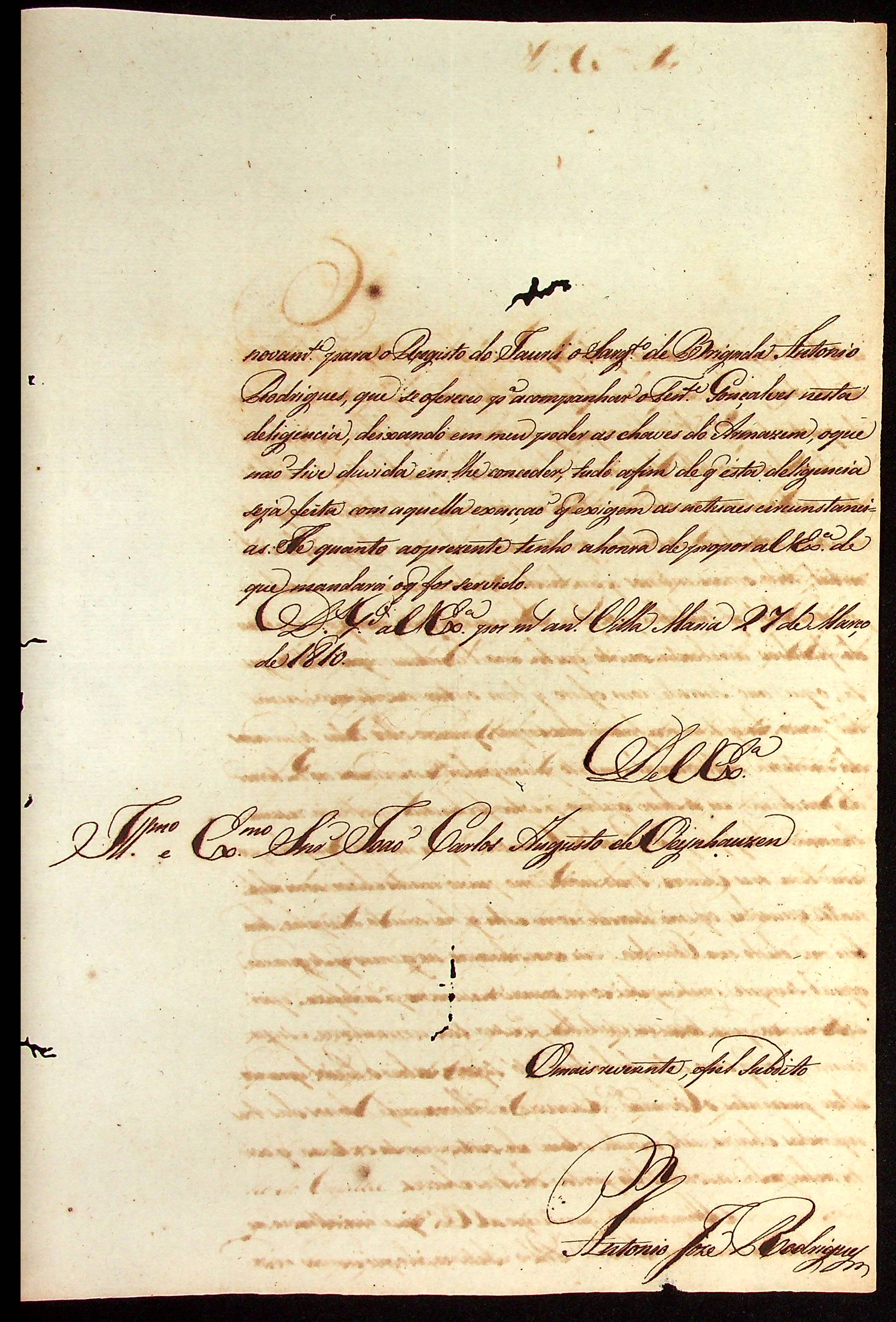 CARTA de Antônio José Rodrigues ao [Governador e Capitão-General da Capitania de Mato Grosso] João Carlos Augusto d’Oeynhausen e Gravenberg.
