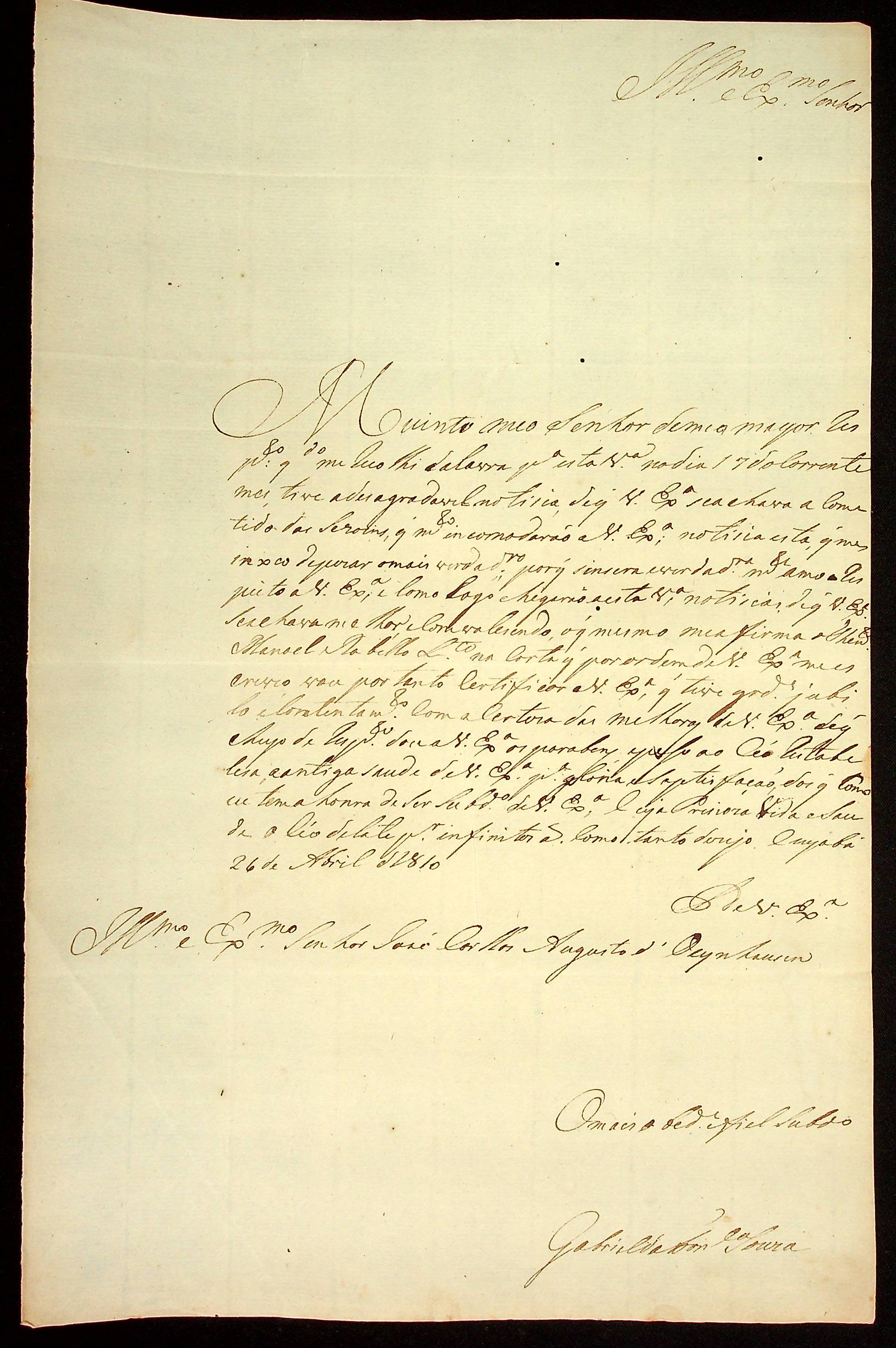 CARTA do [Tenente-Coronel da Legião de Milícias] Gabriel de Fonseca Souza ao [Governador e Capitão-General da Capitania de Mato Grosso] João Carlos Augusto d’Oeynhausen e Gravenberg.