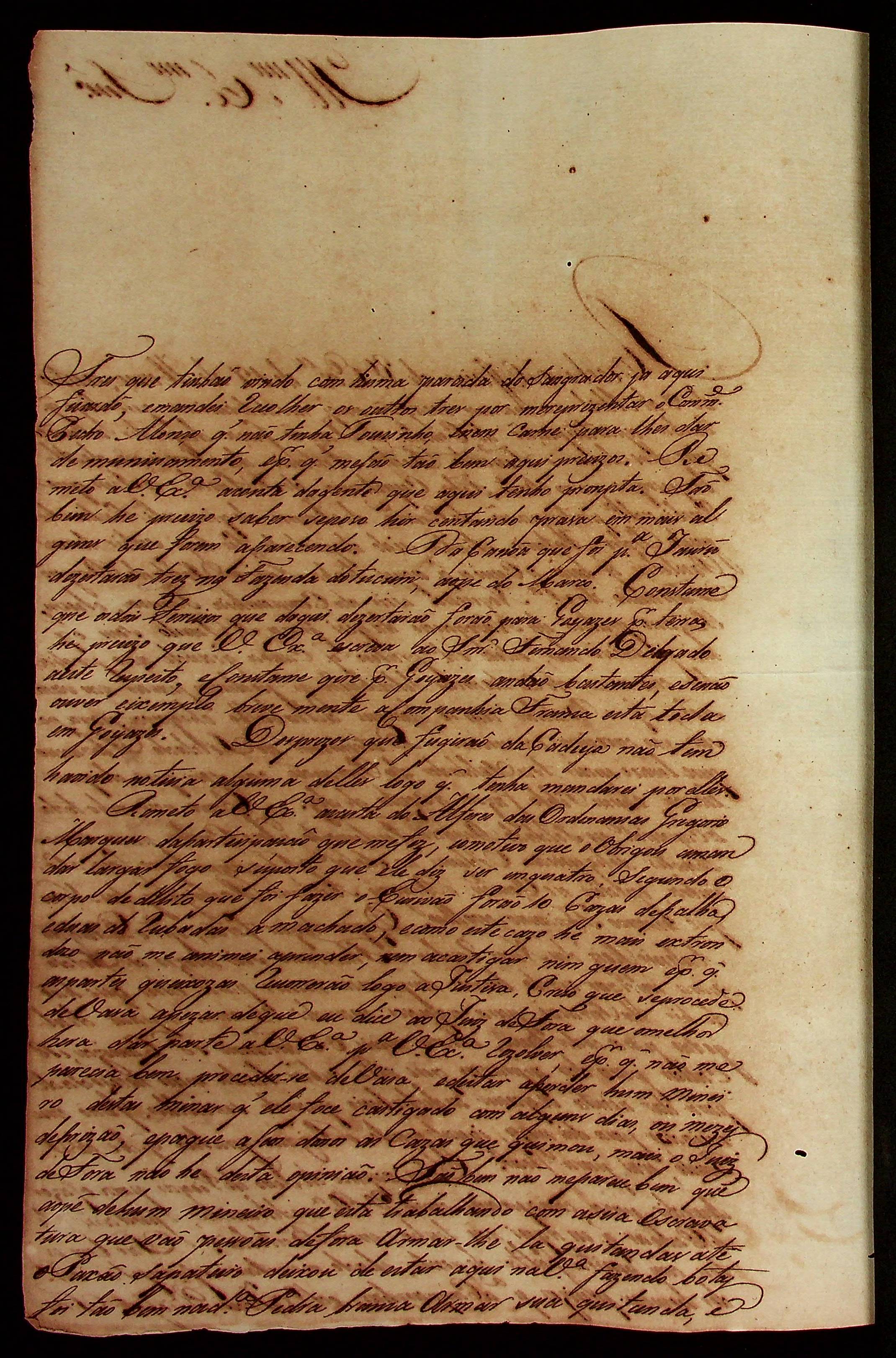 CARTA do [Sargento-mor Ajudante de Ordens] Alexandre José Leite de Chaves Melo ao [Governador e Capitão General da Capitania de Mato Grosso] João Carlos Augusto d’Oeynhausen e Gravenberg.