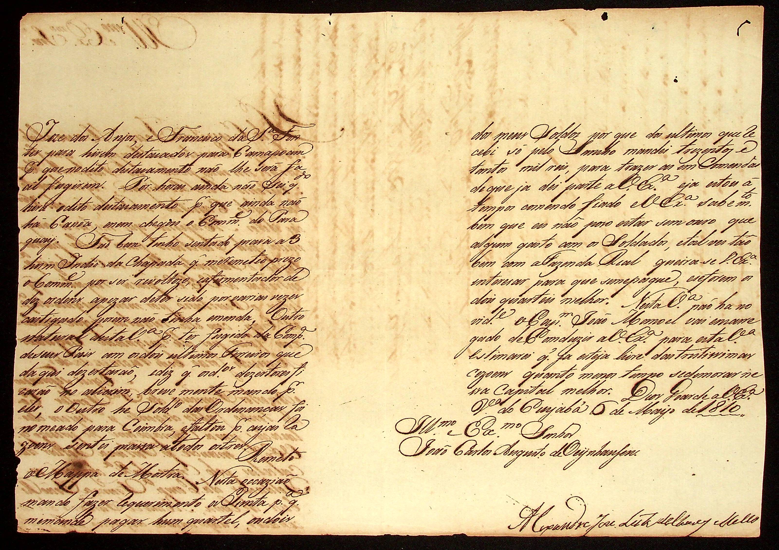 CARTA do [Sargento-mor Ajudante de Ordens] Alexandre José Leite de Chaves Melo ao [Governador e Capitão General da Capitania de Mato Grosso] João Carlos Augusto d’Oeynhausen e Gravenberg.
