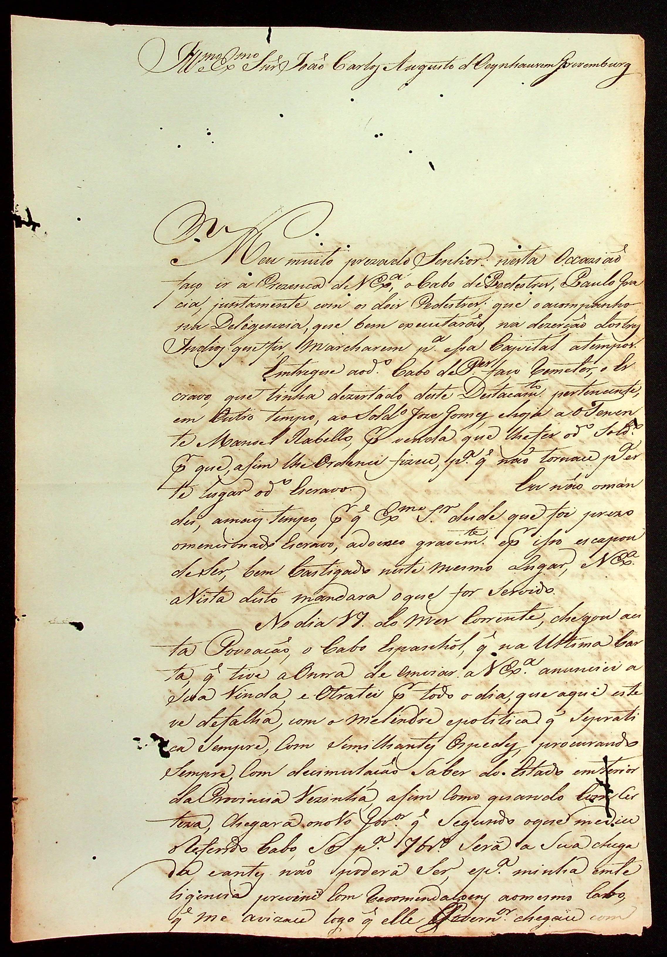 CARTA do [Comandante de Casalvasco] Flaviano José de Matos Coelho ao [Governador e Capitão-General da Capitania de Mato Grosso] João Carlos Augusto d’Oeynhausen e Gravenberg.