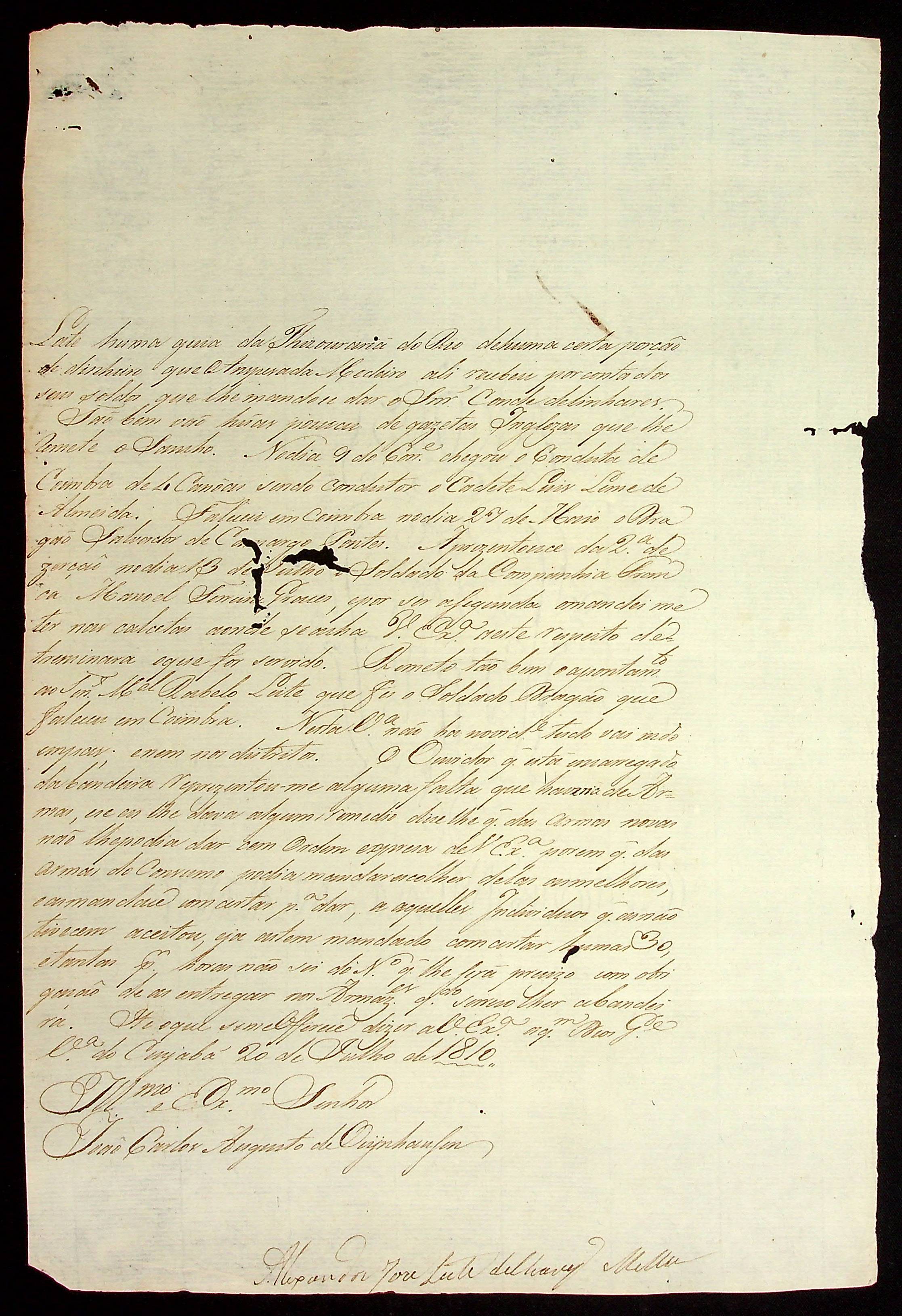 CARTA do [Sargento mor Ajudante de Ordens] Alexandre José Leite Chaves de Melo ao [Governador e Capitão-General da Capitania de Mato Grosso] João Carlos Augusto d’Oeynhausen e Gravenberg.