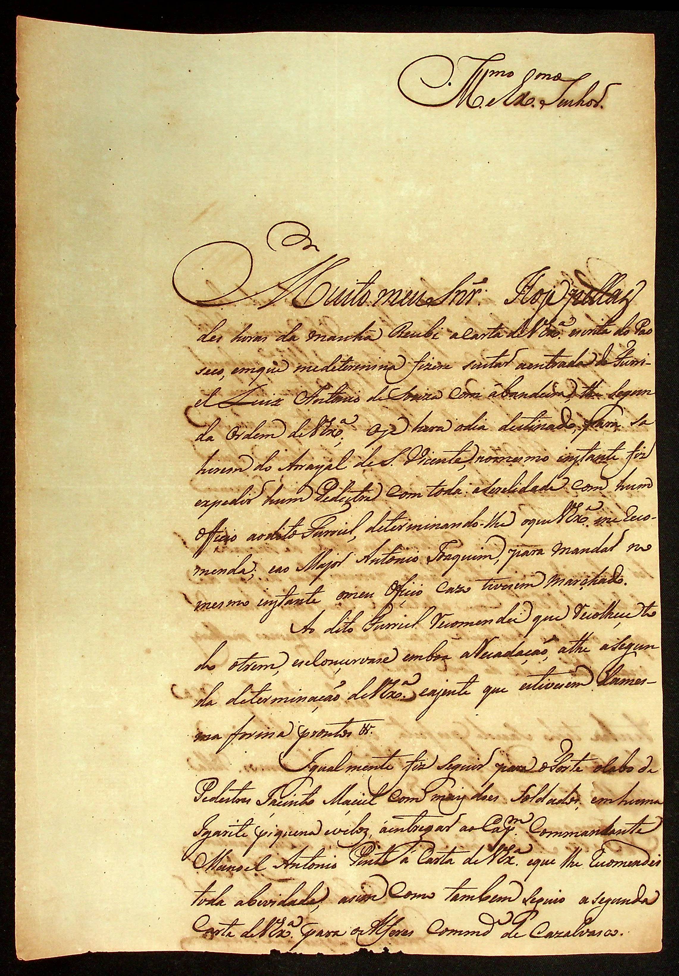 CARTA do [Sargento-mor Comandante Chefe] Vitoriano Lopes de Macedo ao [Governador e Capitão-General da Capitania de Mato Grosso] João Carlos Augusto d’Oeynhausen e Gravenberg.