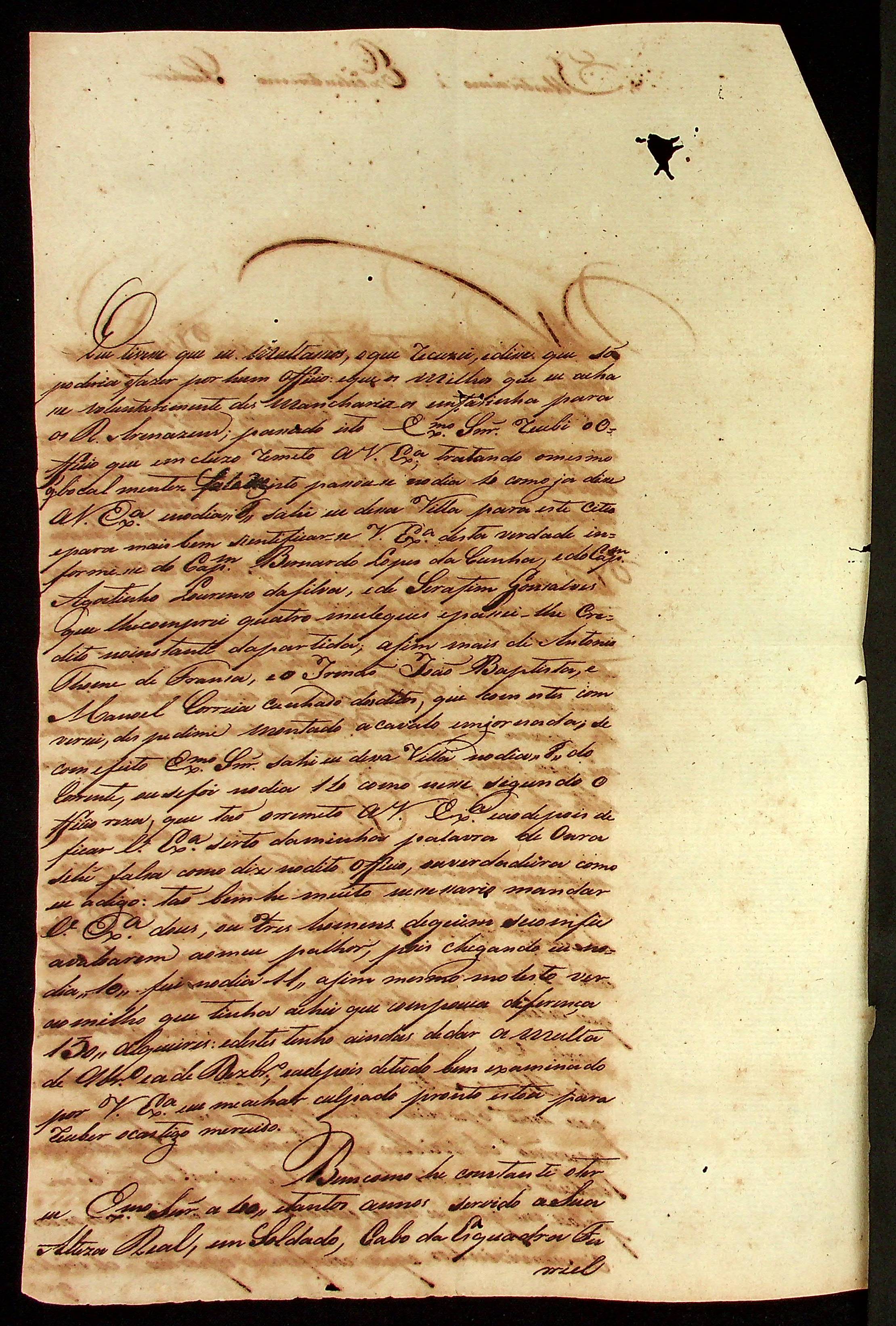 CARTA do Capitão da 1ª Companhia de Esquadra Ignácio de Souza Oliveira ao [Governador e Capitão-General da Capitania de Mato Grosso] João Carlos Augusto d’Oeynhausen e Gravenberg.