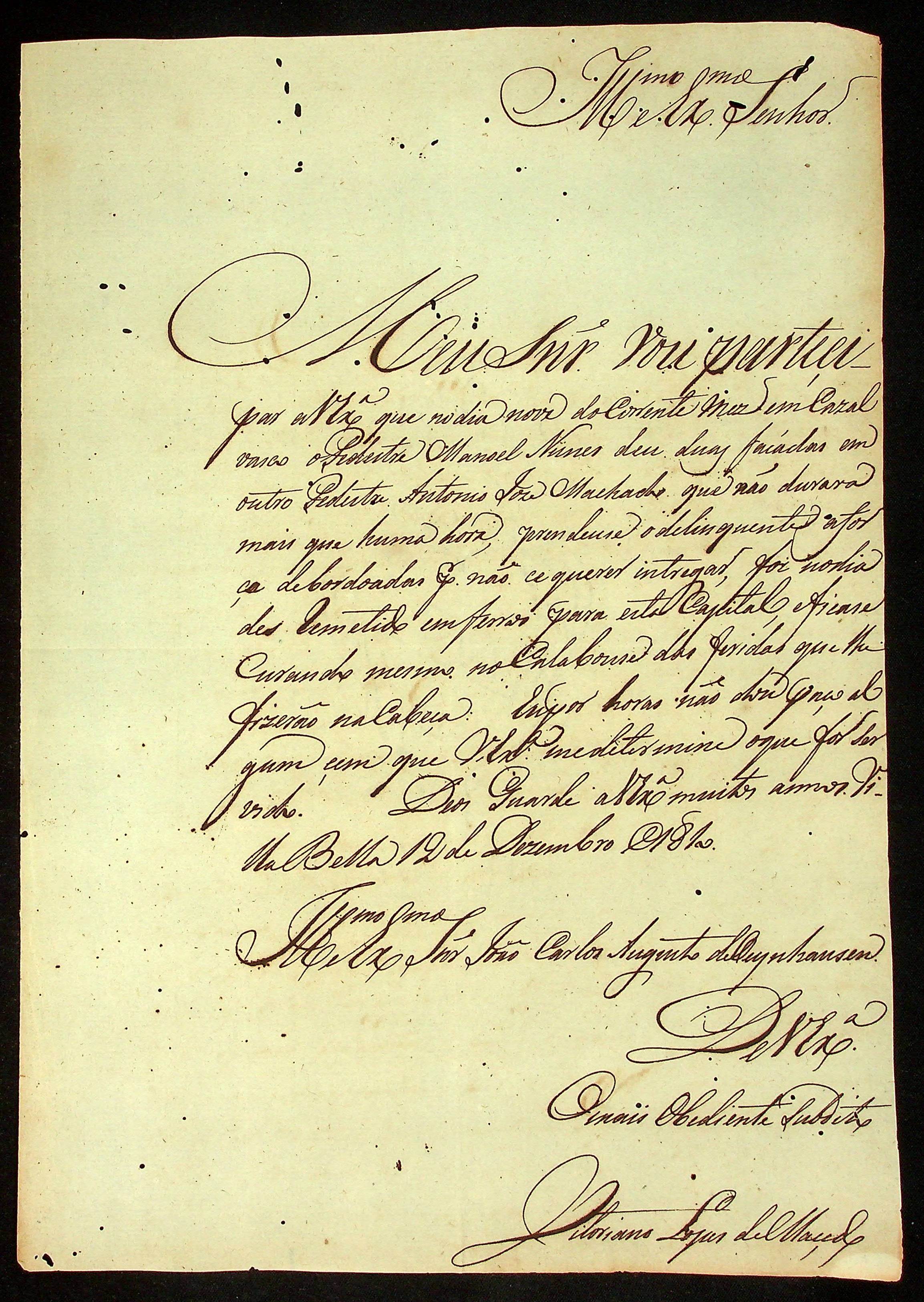 CARTA do [Sargento-mor Comandante] Vitoriano Lopes de Macedo ao [Governador e Capitão-General da Capitania de Mato Grosso] João Carlos Augusto d’Oeynhausen e Gravenberg.