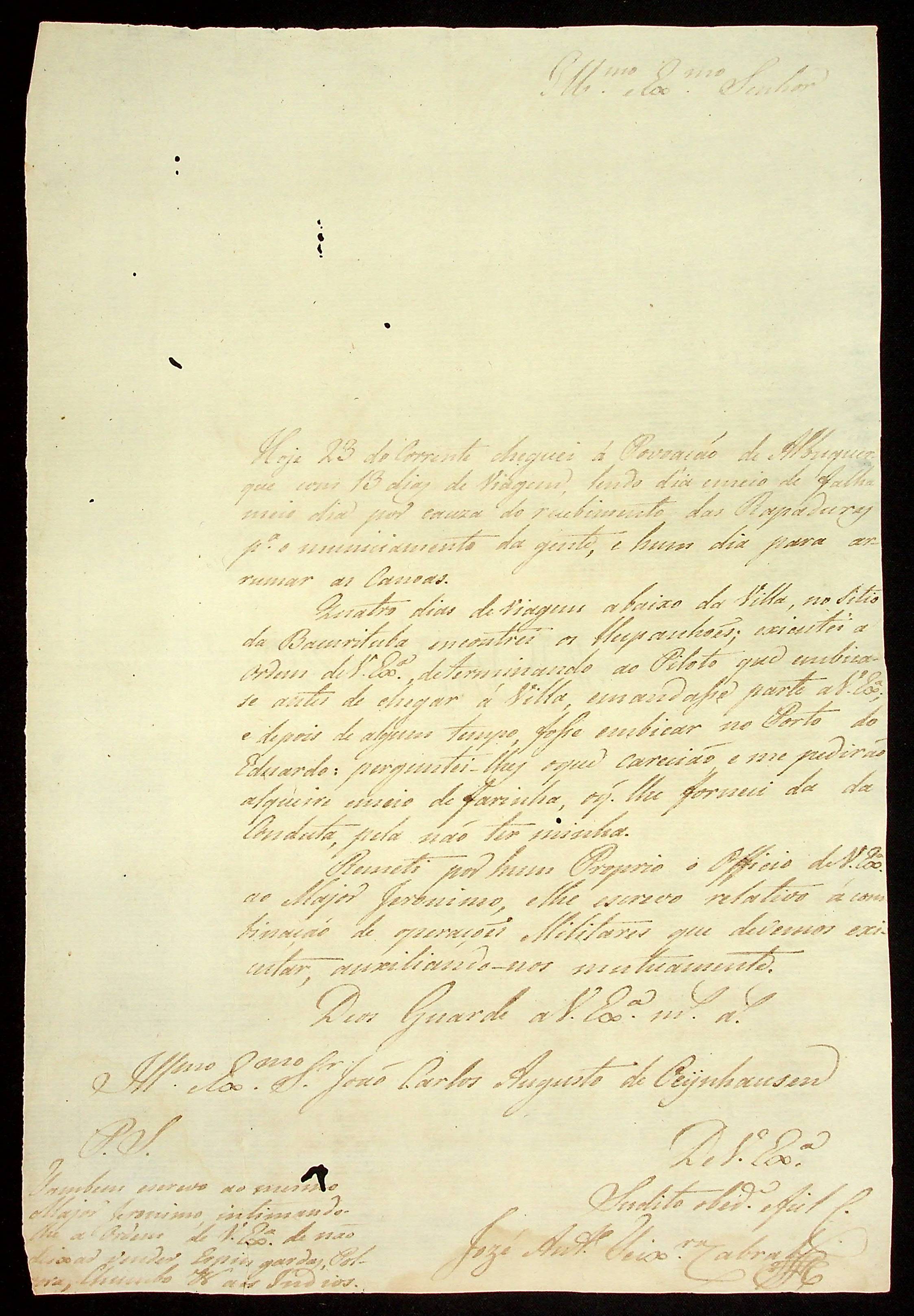 CARTA do [Sargento-mor] José Antônio Teixeira Cabral Miranda ao [Governador e Capitão-General da Capitania de Mato Grosso] João Carlos Augusto d’Oeynhausen e Gravenberg.