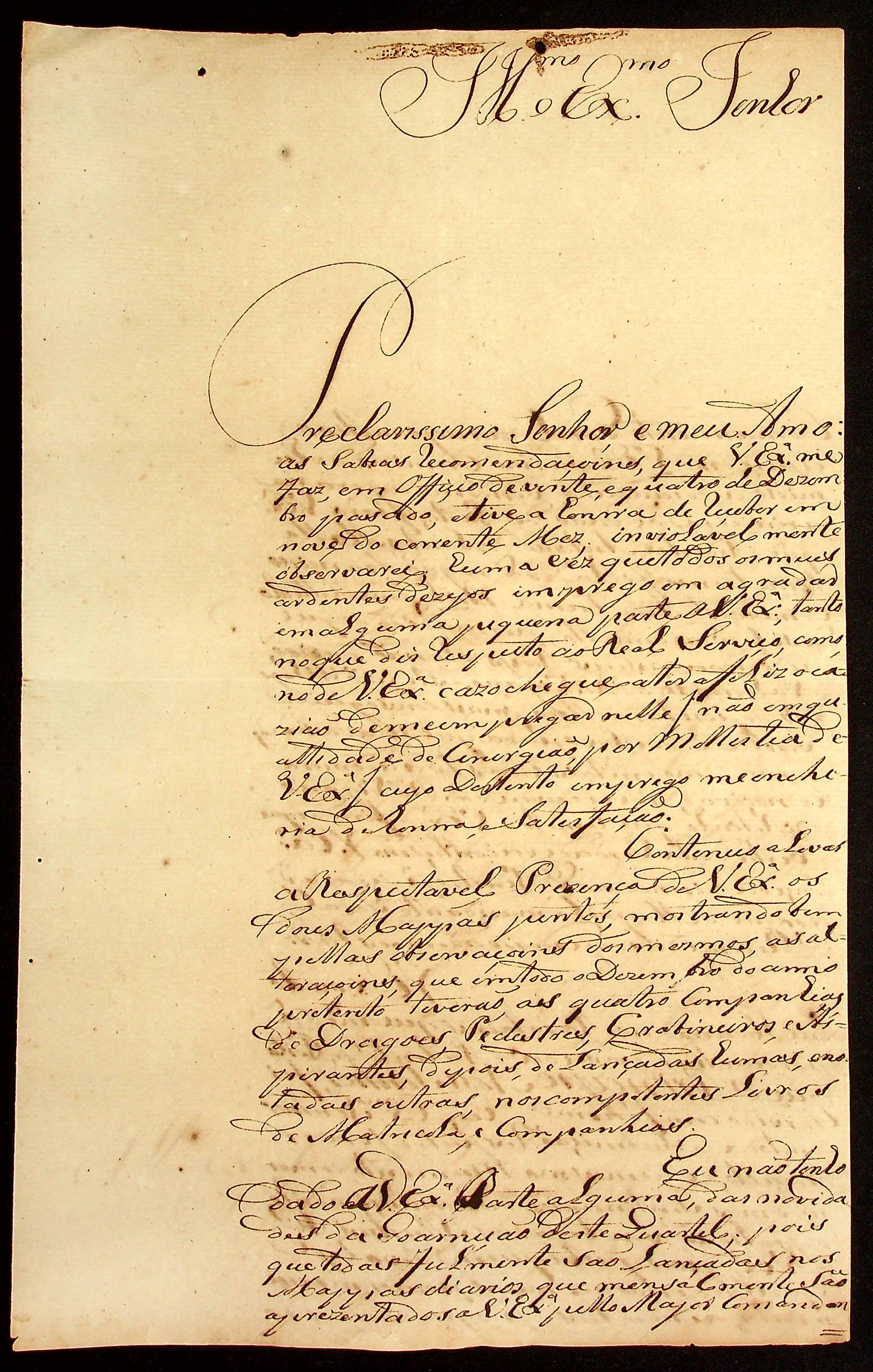 CARTA do Furriel e Comandante Interino Luís Antônio de Souza ao [Governador e Capitão-General da Capitania de Mato Grosso] João Carlos Augusto d’Oeynhausen e Gravenberg.