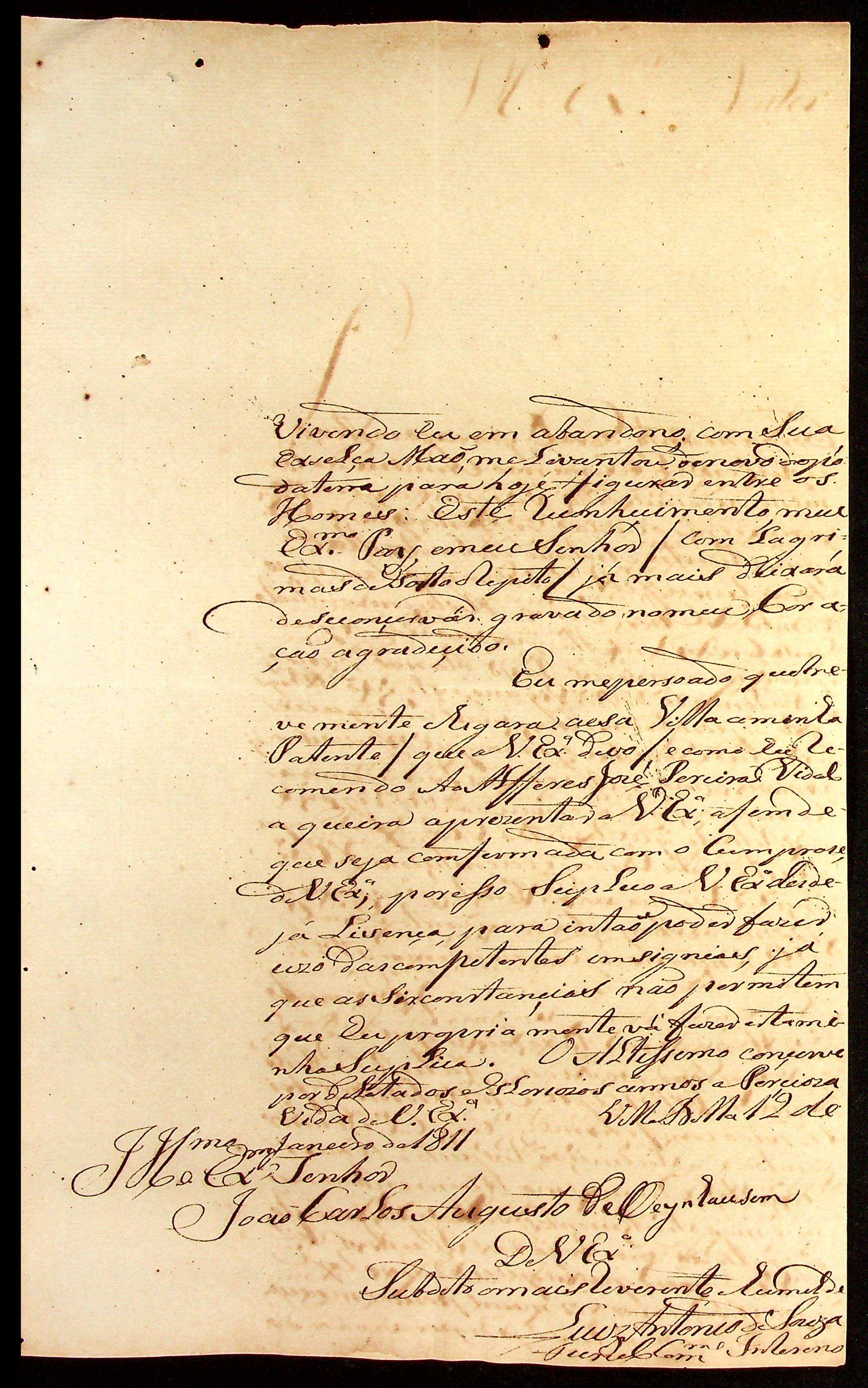 CARTA do Furriel e Comandante Interino Luís Antônio de Souza ao [Governador e Capitão-General da Capitania de Mato Grosso] João Carlos Augusto d’Oeynhausen e Gravenberg.