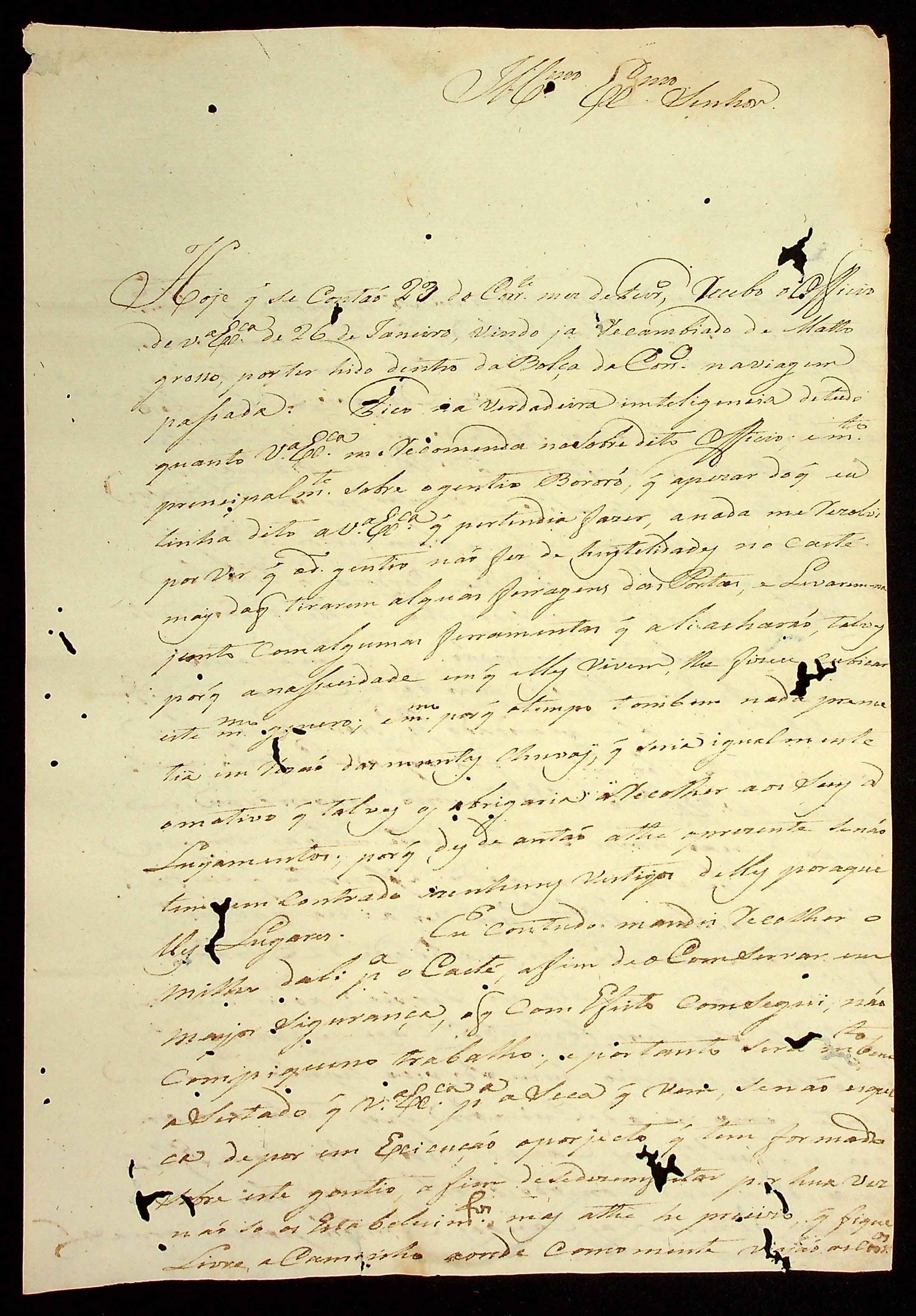CARTA do Comandante João Pereira Leite ao [Governador e Capitão-general da Capitania de Mato Grosso] João Carlos Augusto d’Oeynhausen e Gravenberg.