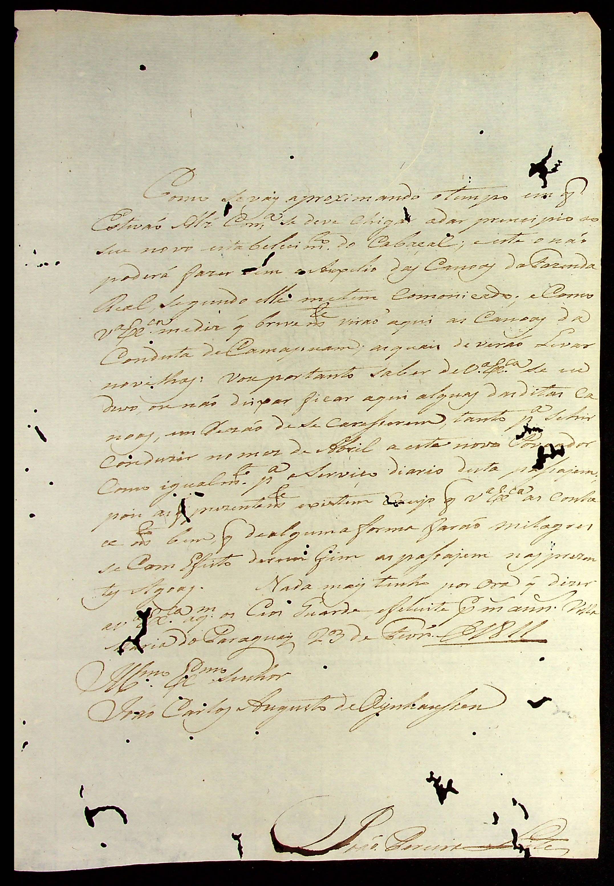 CARTA do Comandante João Pereira Leite ao [Governador e Capitão-general da Capitania de Mato Grosso] João Carlos Augusto d’Oeynhausen e Gravenberg.