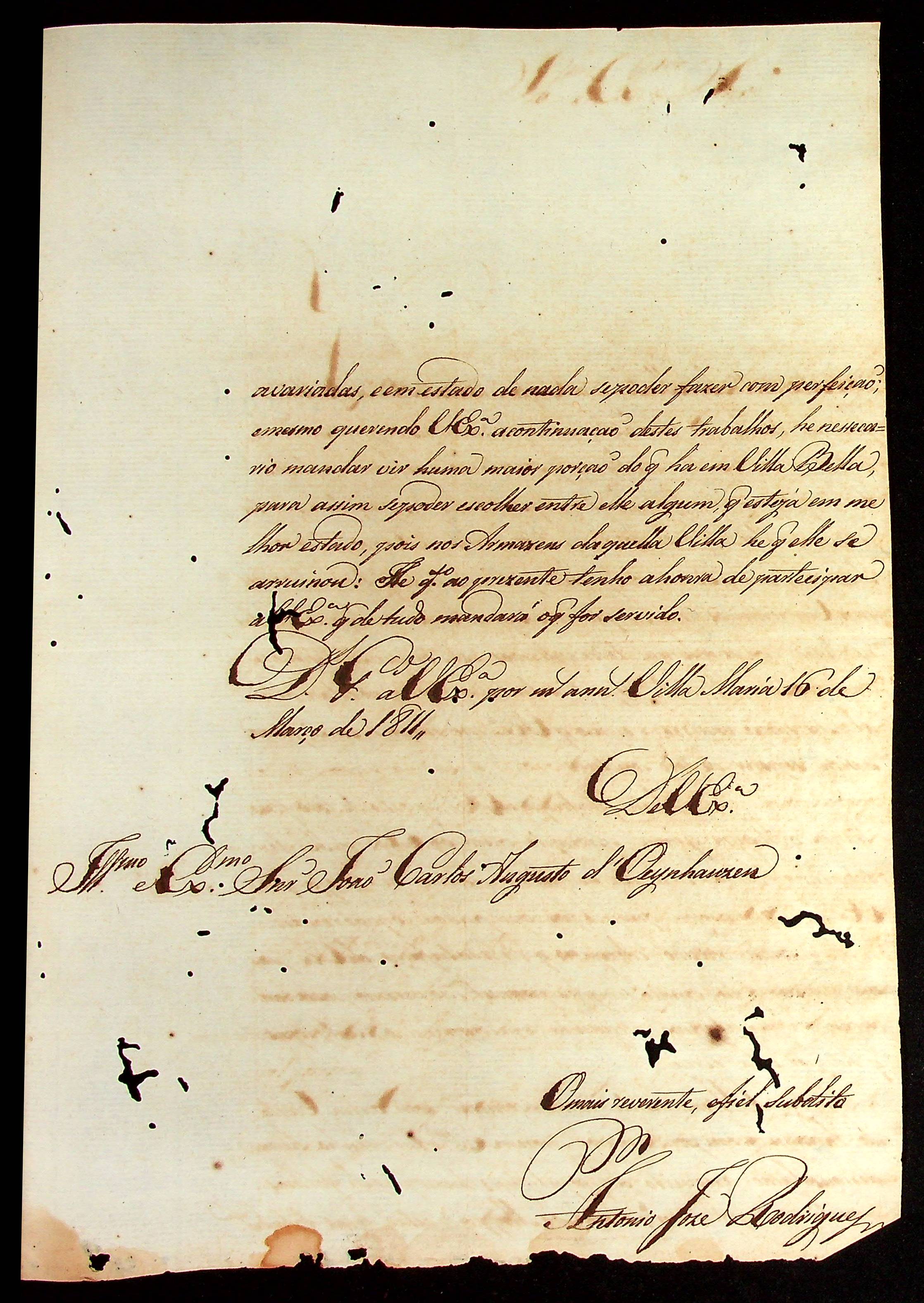 CARTA do [Sargento-mor Comandante da Fronteira] Antônio José Rodrigues ao [Governador e Capitão-General da Capitania de Mato Grosso] João Carlos Augusto d’Oeynhausen e Gravenberg.