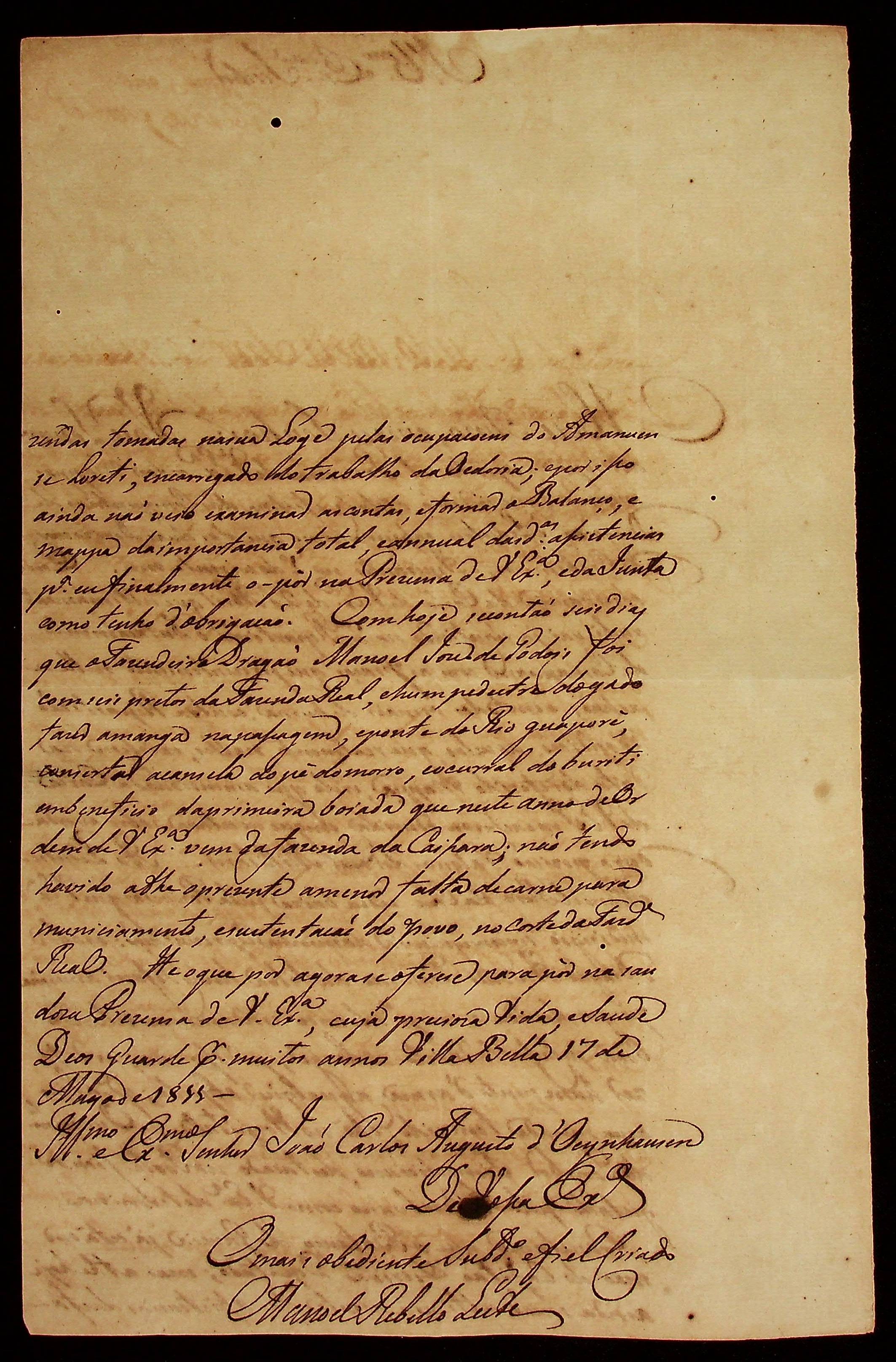 CARTA do [Tenente Comandante] Manoel Rebelo Leite ao [Governador e Capitão-General da Capitania de Mato Grosso] João Carlos Augusto d’Oeynhausen e Gravenberg.