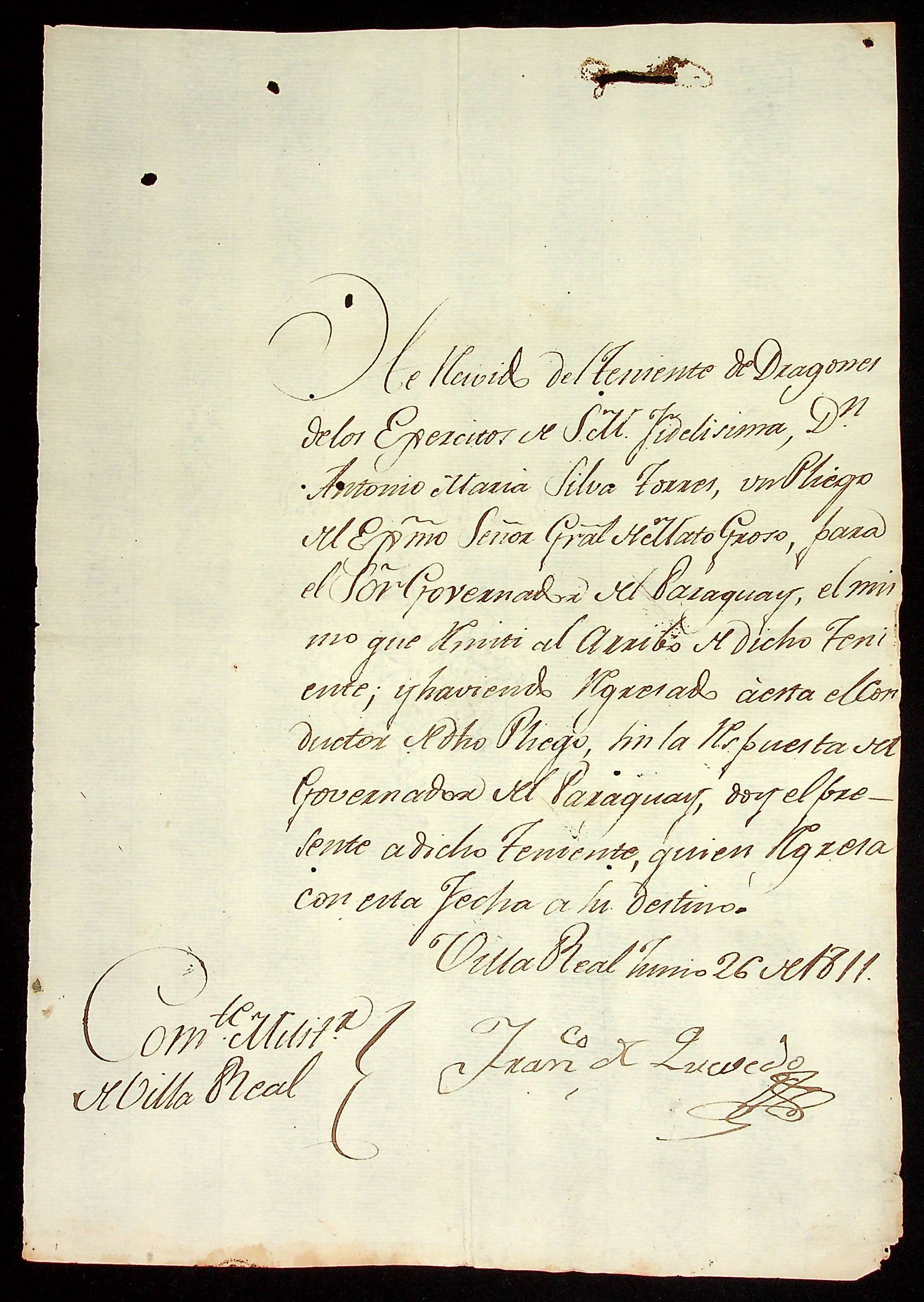 CARTA do Comandante Militar da Vila Real Francisco [Xavier] Quevedo sobre o regresso do Tenente de Dragões Antônio Maria Silva Torres ao Paraguai.