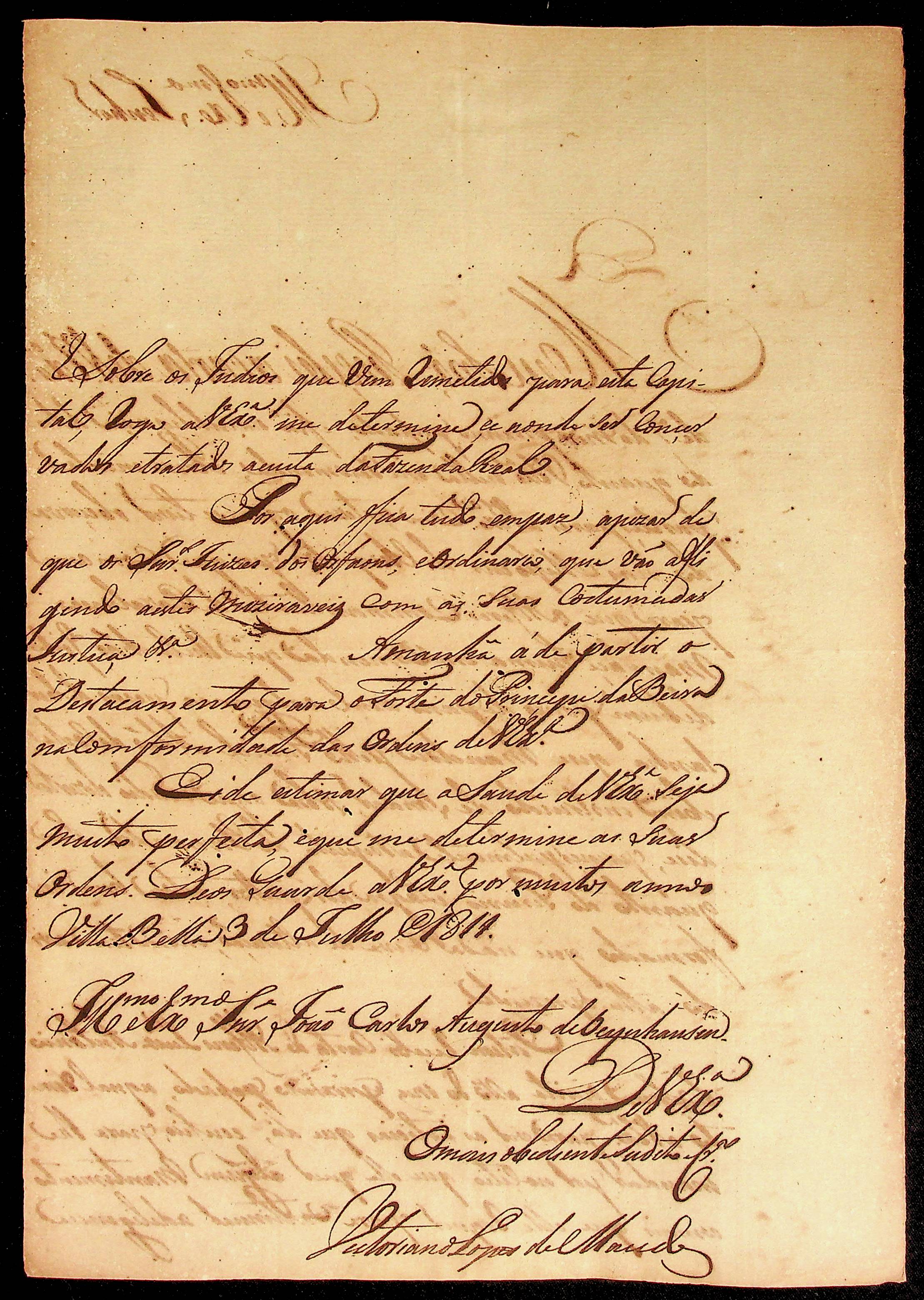 CARTA do [Sargento-mor] Vitoriano Lopes de Macedo ao [Governador e Capitão-General da Capitania de Mato Grosso] João Carlos Augusto d’Oeynhausen e Gravenberg.