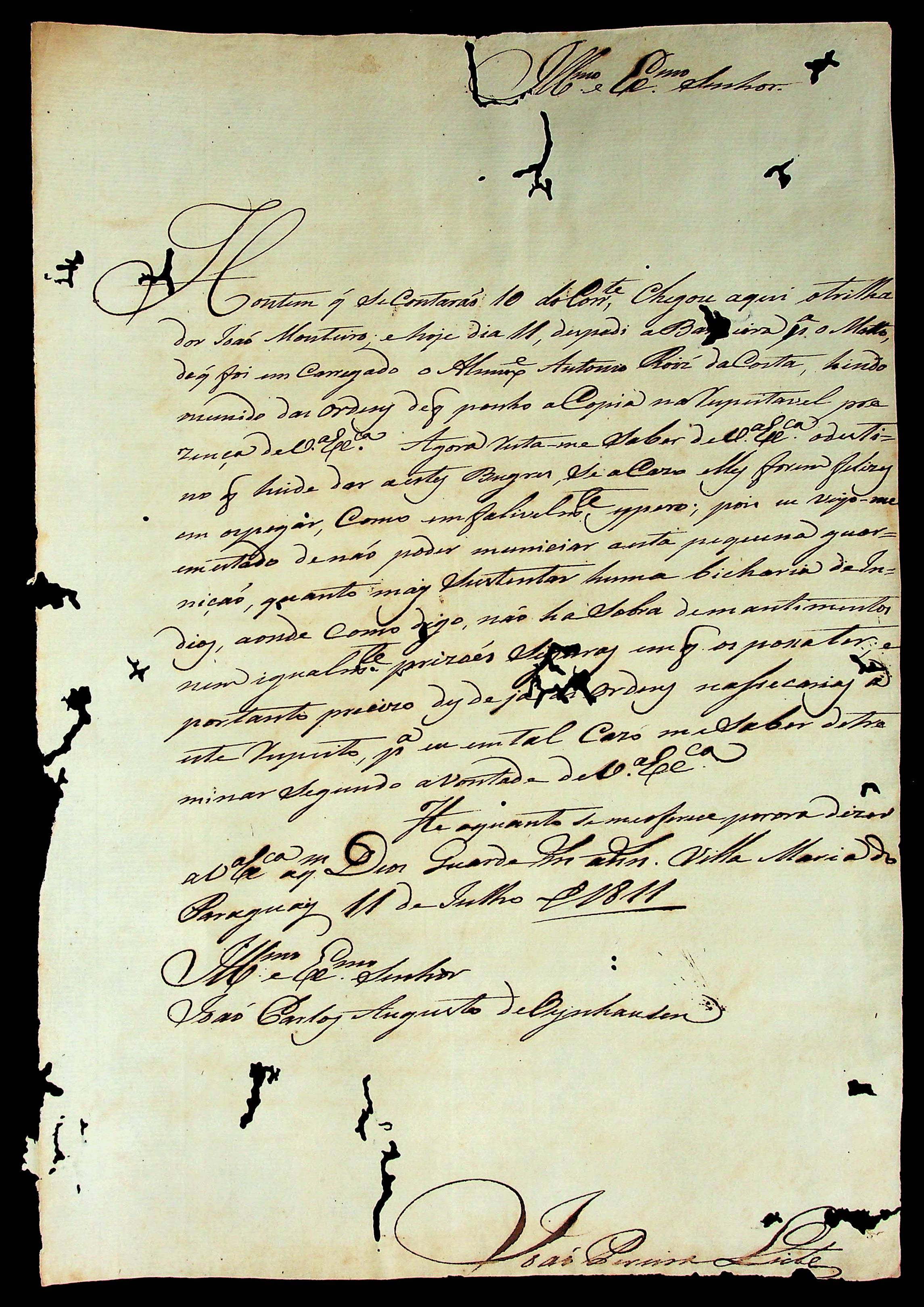 CARTA do [Comandante] João Pereira Leite ao [Governador e Capitão-General da Capitania de Mato Grosso] João Carlos Augusto d’Oeynhausen e Gravenberg.