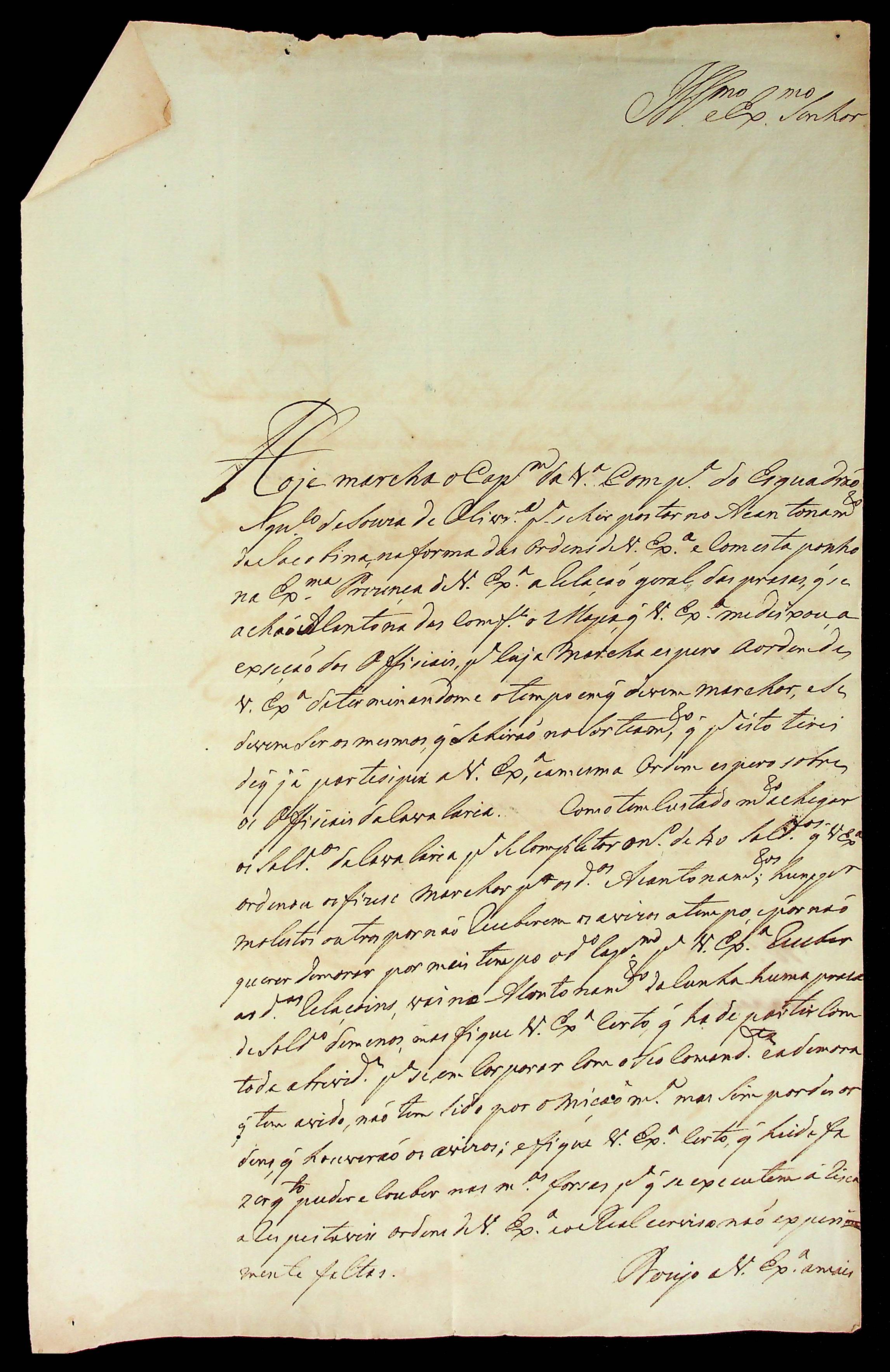 CARTA do [Tenente-Coronel Comandante] Gabriel da Fonseca Souza ao [Governador e Capitão-General da Capitania de Mato Grosso] João Carlos Augusto d’Oeynhausen e Gravenberg.