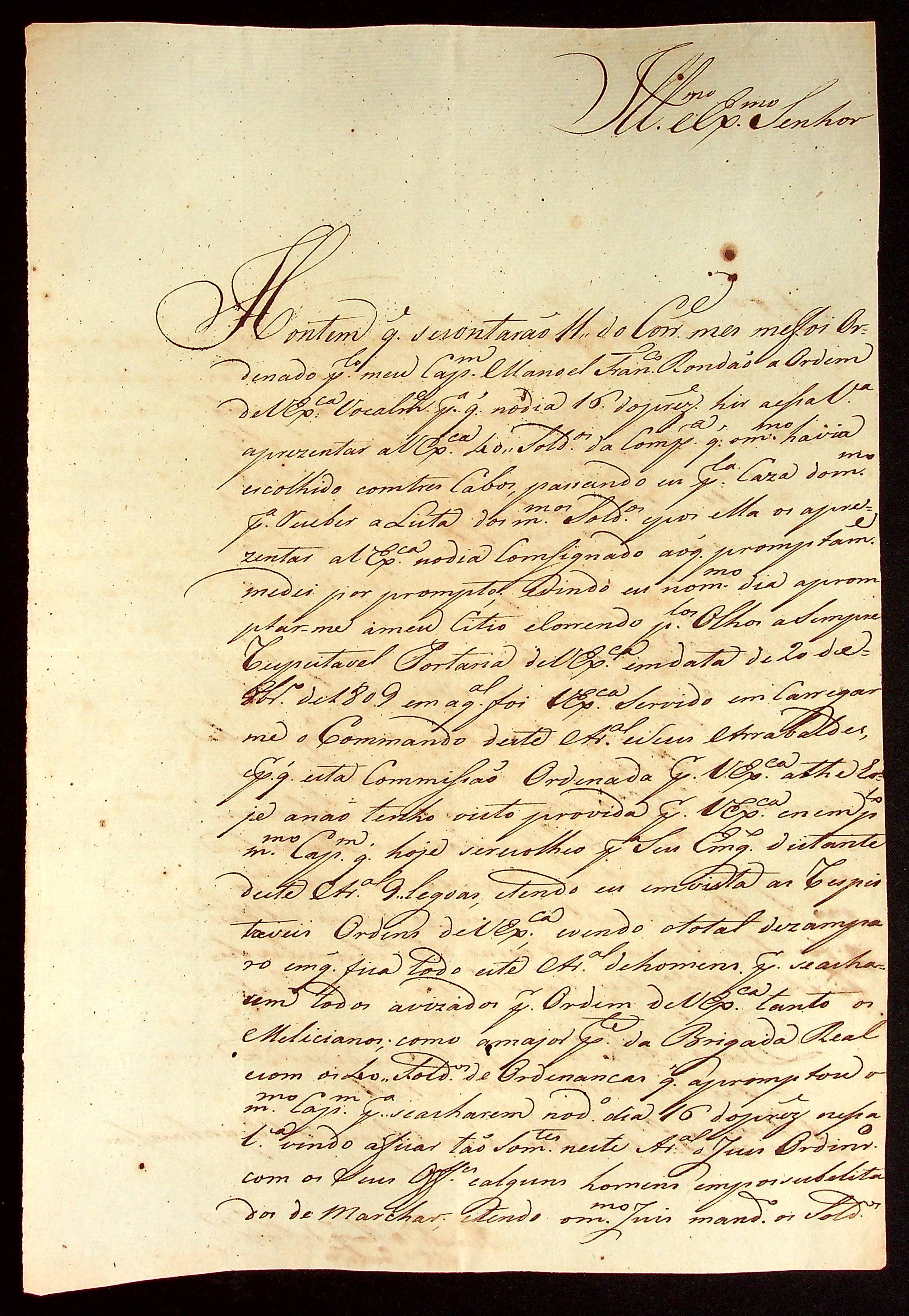 CARTA do Alferes Comandante Vicente Marques de Oliveira ao [Governador e Capitão-General da Capitania de Mato Grosso] João Carlos Augusto d’Oeynhausen e Gravenberg.