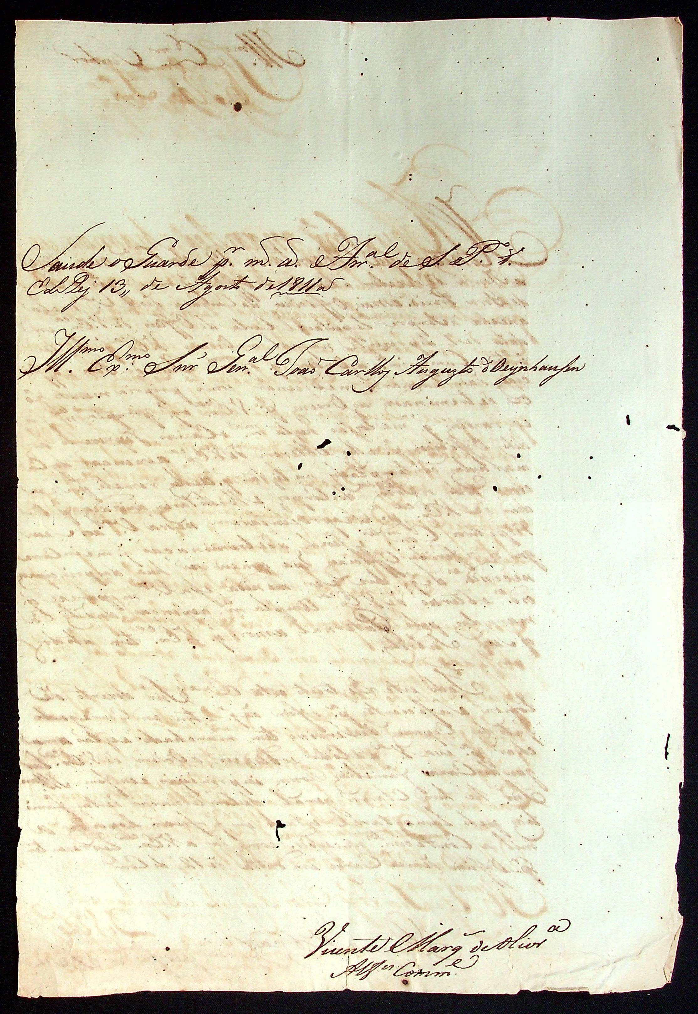 CARTA do Alferes Comandante Vicente Marques de Oliveira ao [Governador e Capitão-General da Capitania de Mato Grosso] João Carlos Augusto d’Oeynhausen e Gravenberg.