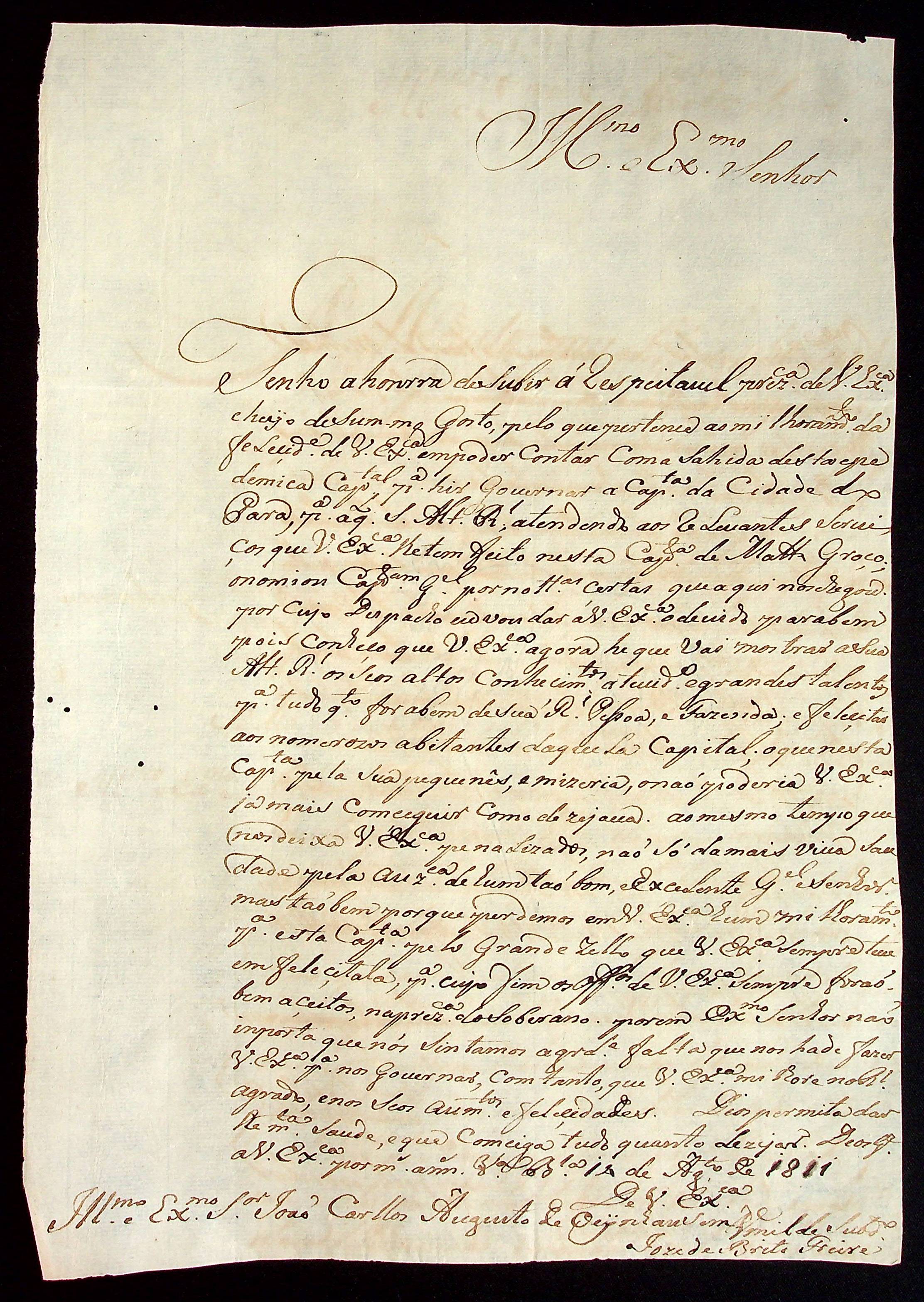 CARTA do [Capitão] José de Brito Freire ao [Governador e Capitão-General da Capitania de Mato Grosso] João Carlos Augusto d’Oeynhausen e Gravenberg.