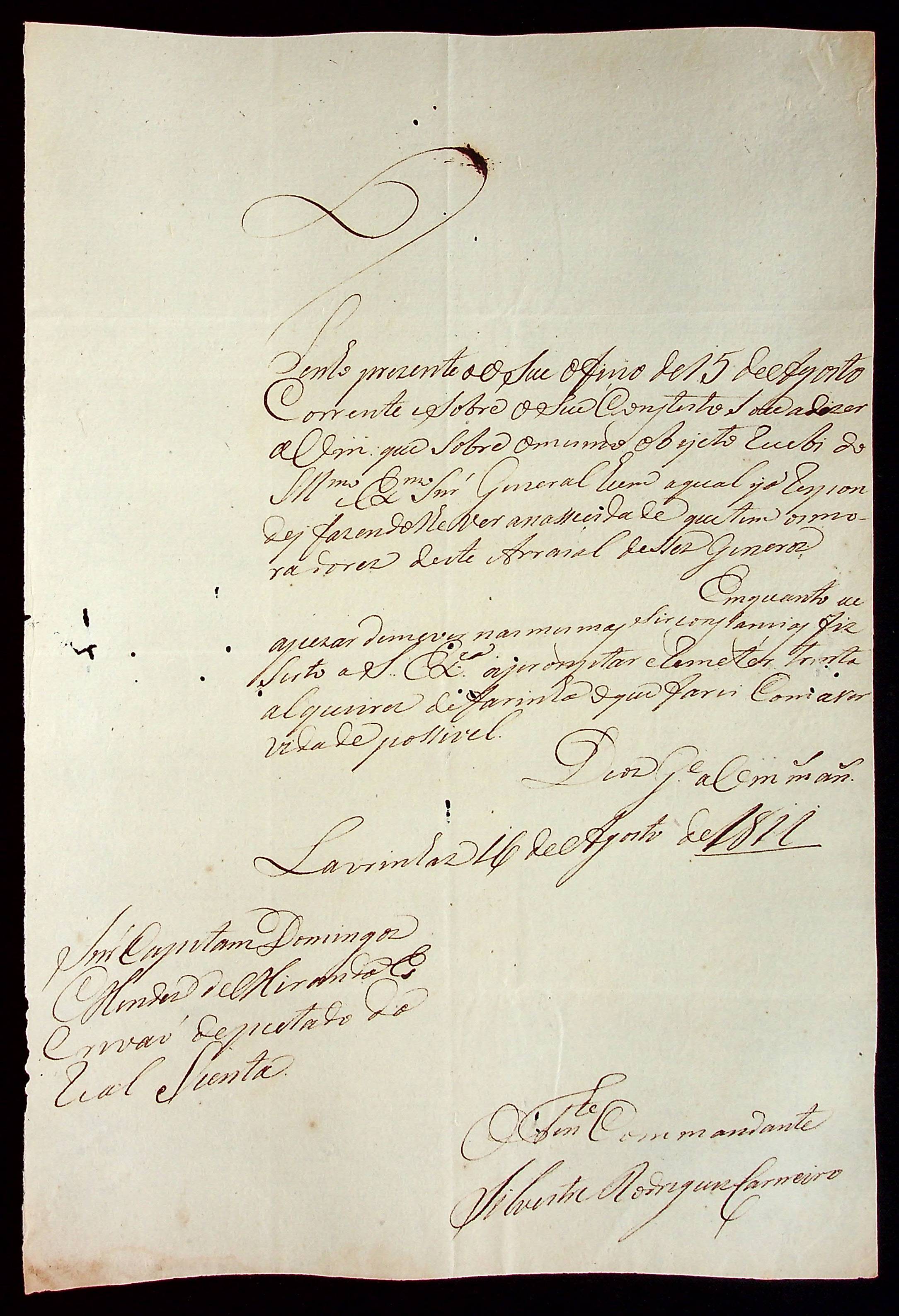 CARTA do Tenente Comandante Silvestre Rodrigues Carneiro ao Capitão e Escrivão-Deputado da Real Junta Domingos Mendes de Miranda.