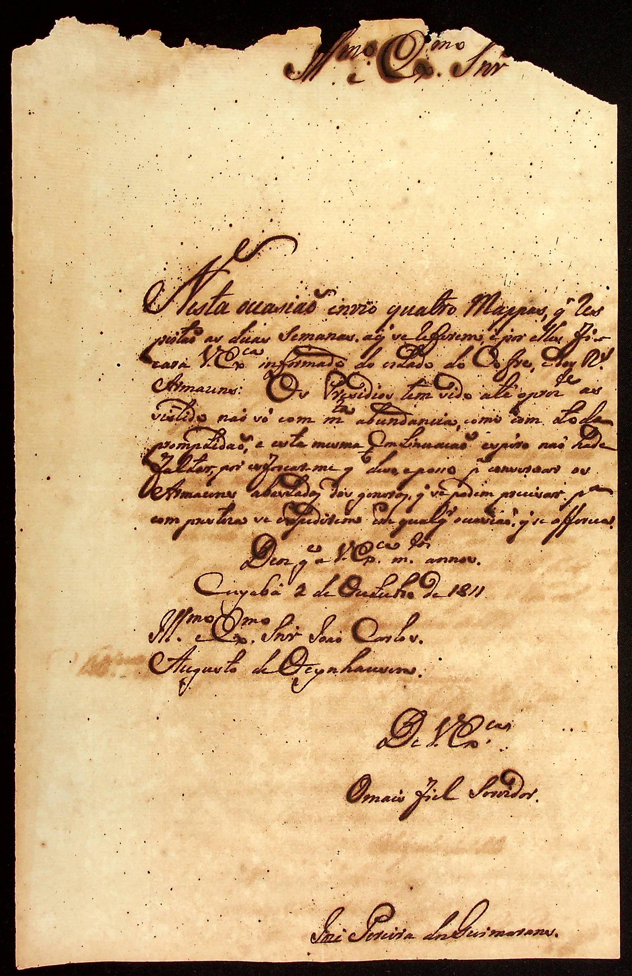 CARTA do [Capitão do Corpo das Ordenanças] José Pereira dos Guimarães ao [Governador e Capitão-General da Capitania de Mato Grosso] João Carlos Augusto d’Oeynhausen e Gravenberg.