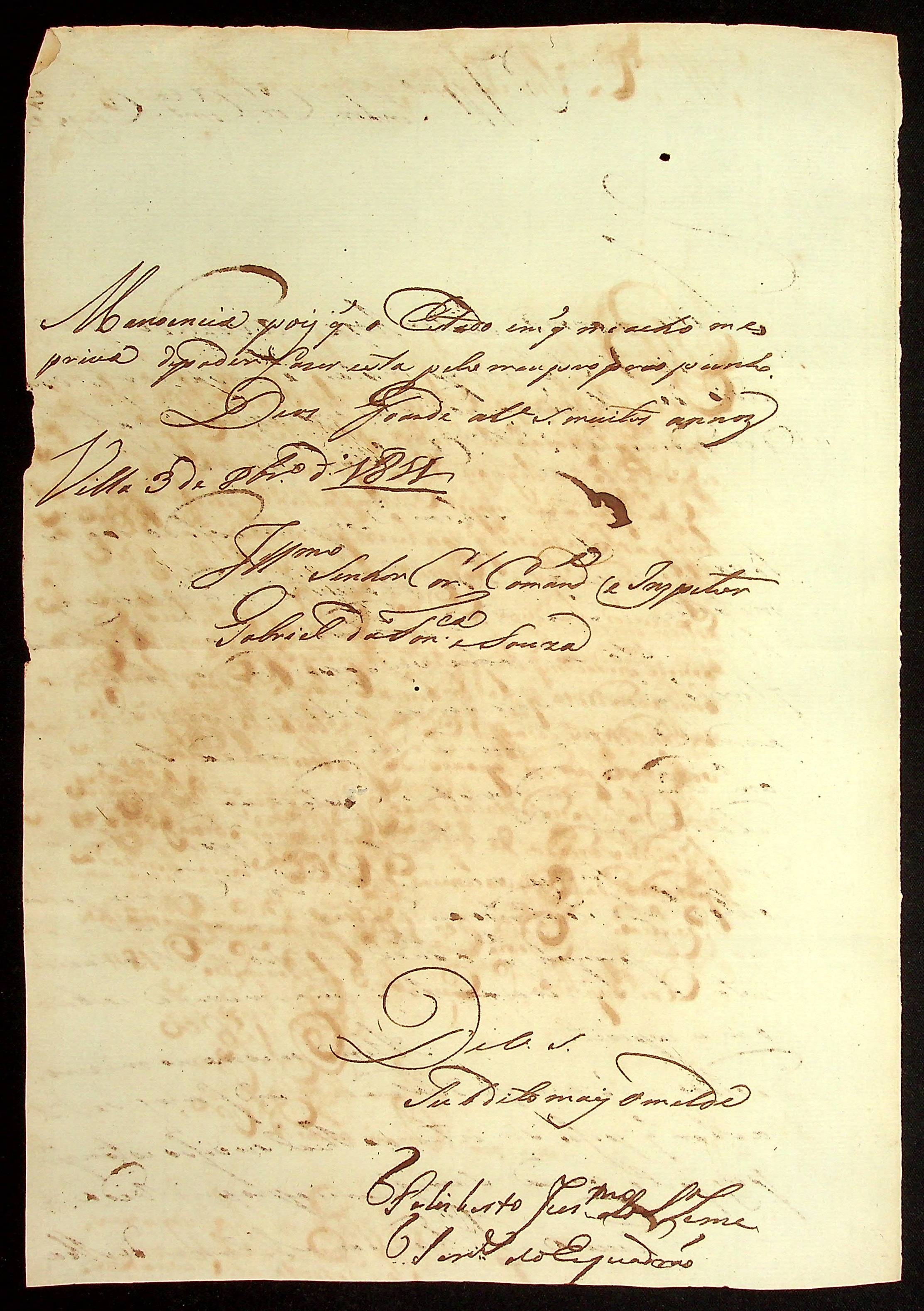 CARTA do Tenente do Esquadrão Felisberto Justino da Silva Leme ao Coronel Comandante e Inspetor Gabriel da Fonseca e Souza.