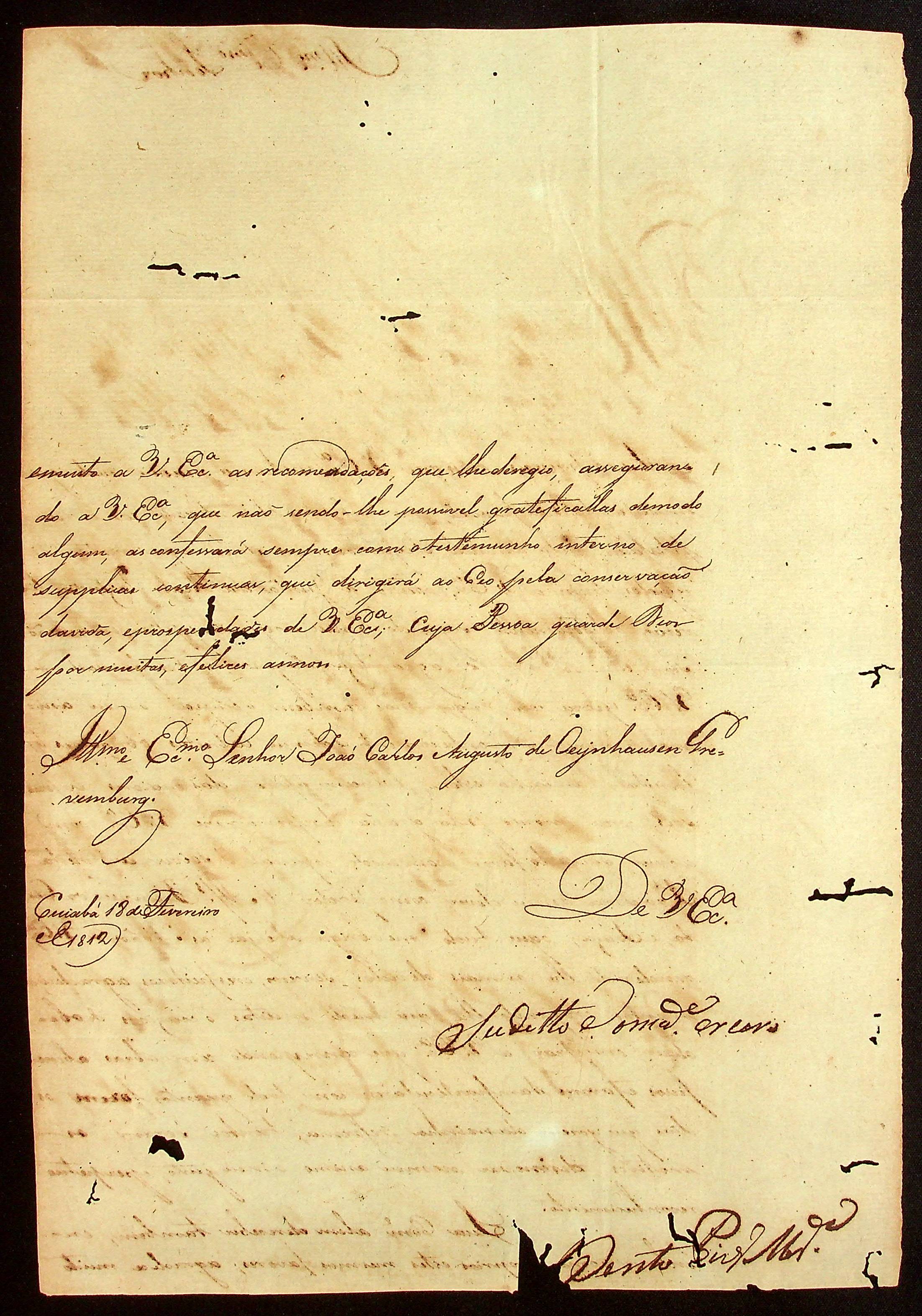 CARTA do [Tenente] Bento Pires de Miranda ao [Governador e Capitão-General da Capitania de Mato Grosso] João Carlos Augusto d’Oeynhausen e Gravenberg.