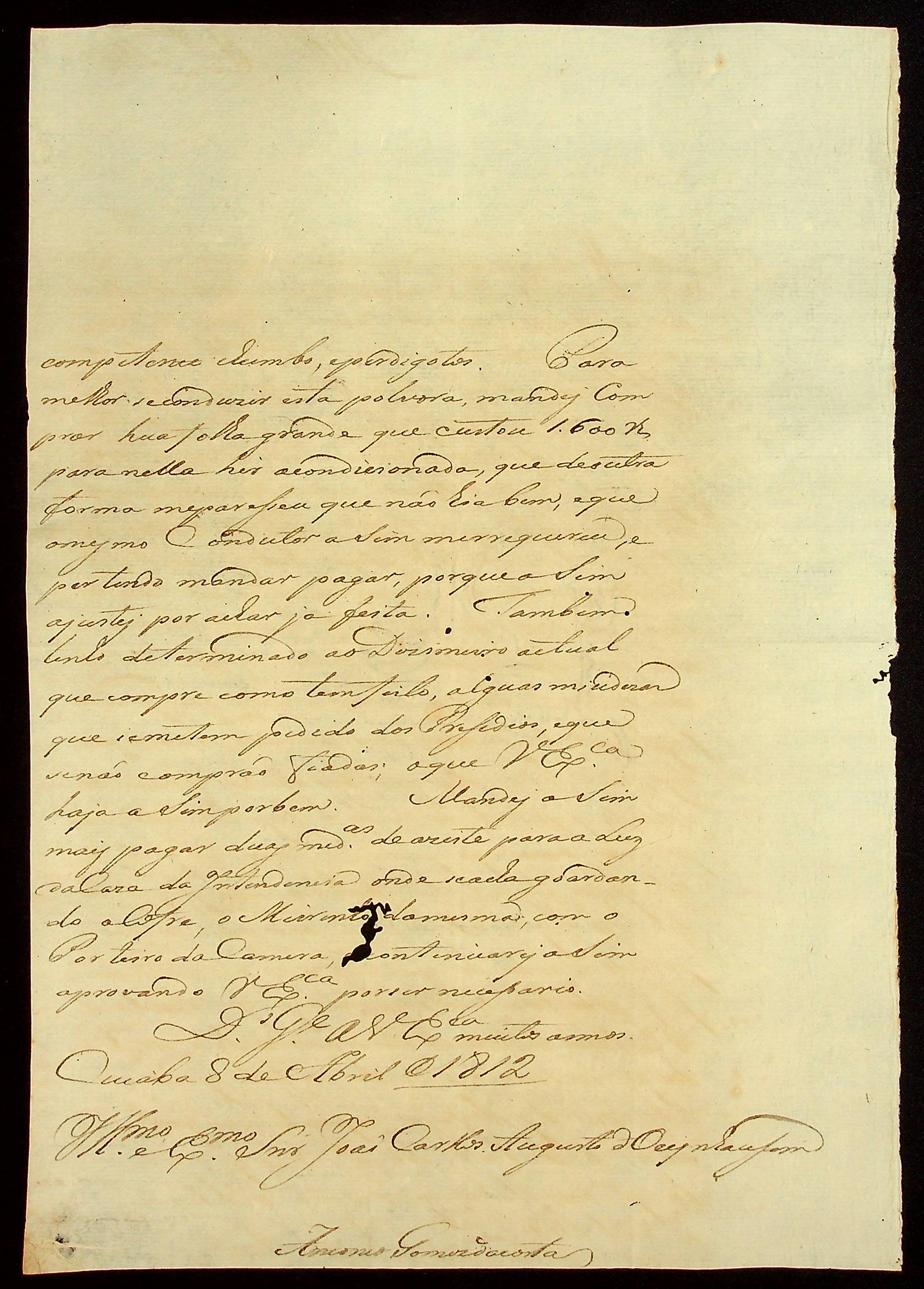 CARTA do [Capitão] Antônio Gomes da Costa ao [Governador e Capitão-General da Capitania de Mato Grosso] João Carlos Augusto d’Oeynhausen e Gravenberg.