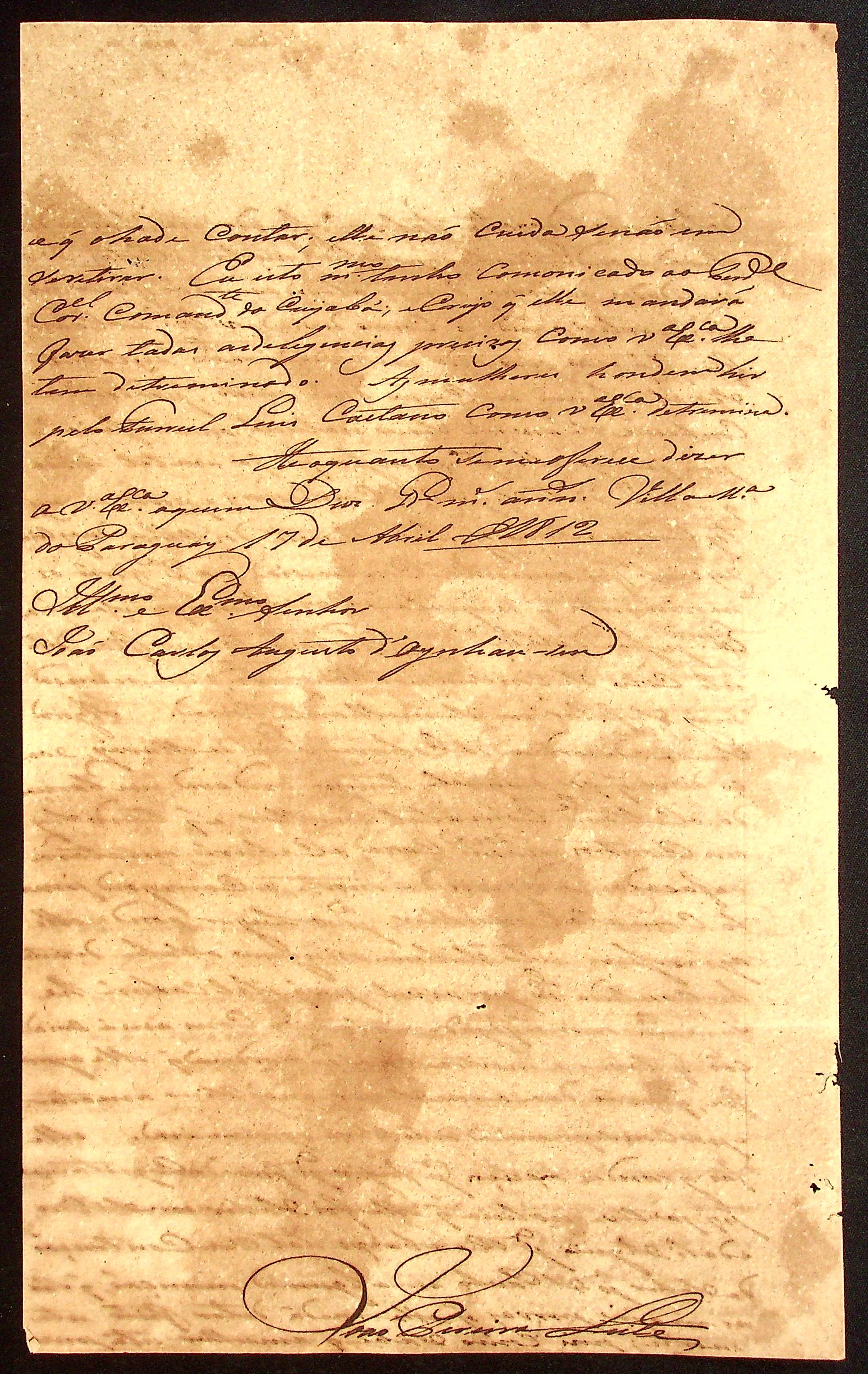 CARTA do [Comandante] João Pereira Leite ao [Governador e Capitão-General da Capitania de Mato Grosso] João Carlos Augusto d’Oeynhausen e Gravenberg.