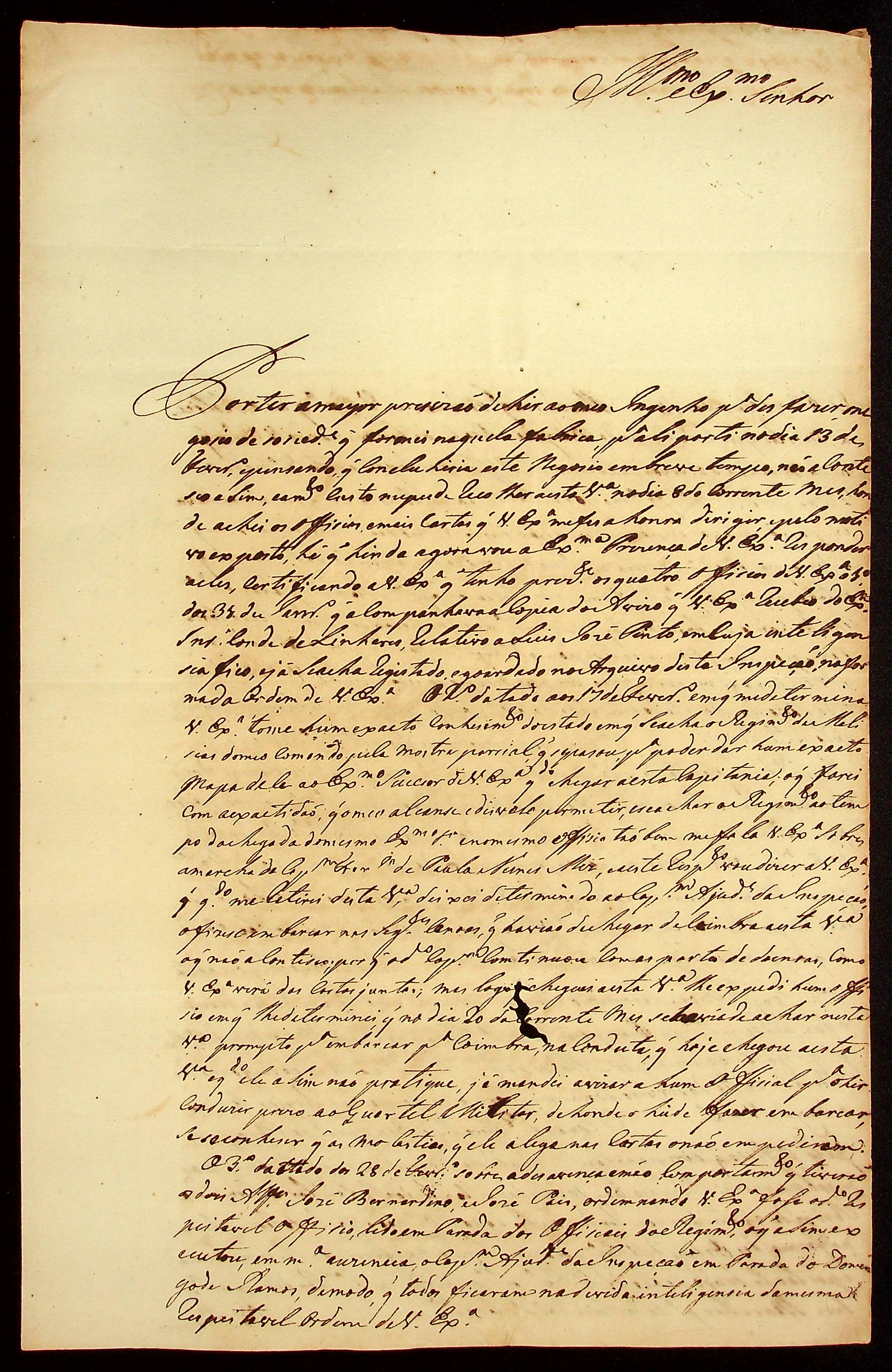 CARTA do [Tenente-Coronel Comandante] Gabriel da Fonseca Souza ao [Governador e Capitão-General da Capitania de Mato Grosso] João Carlos Augusto d’Oeynhausen e Gravenberg.