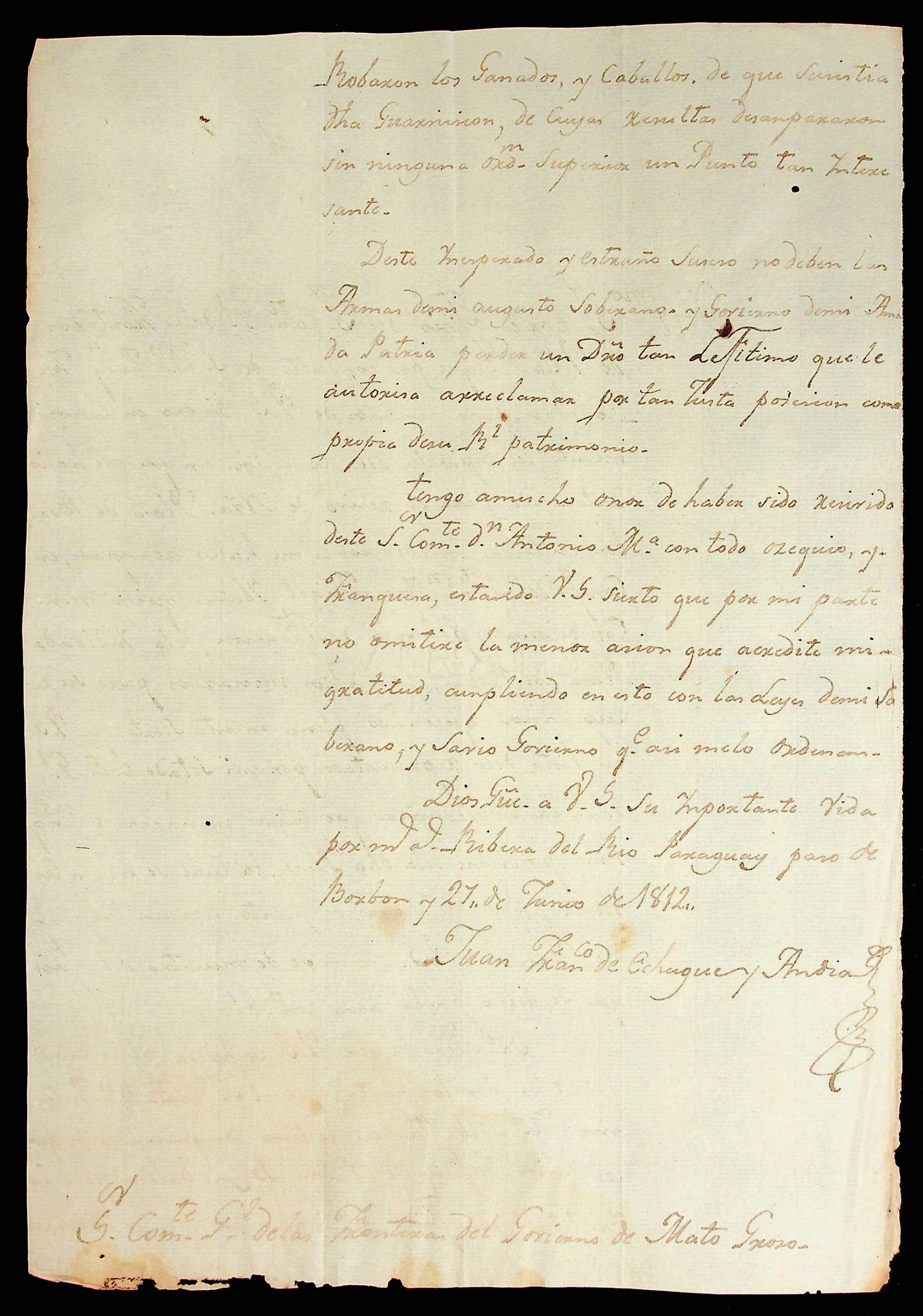 CARTA de Juan Francisco de Echaque e Andia ao Comandante Geral das fronteiras do Governo de Mato Grosso.