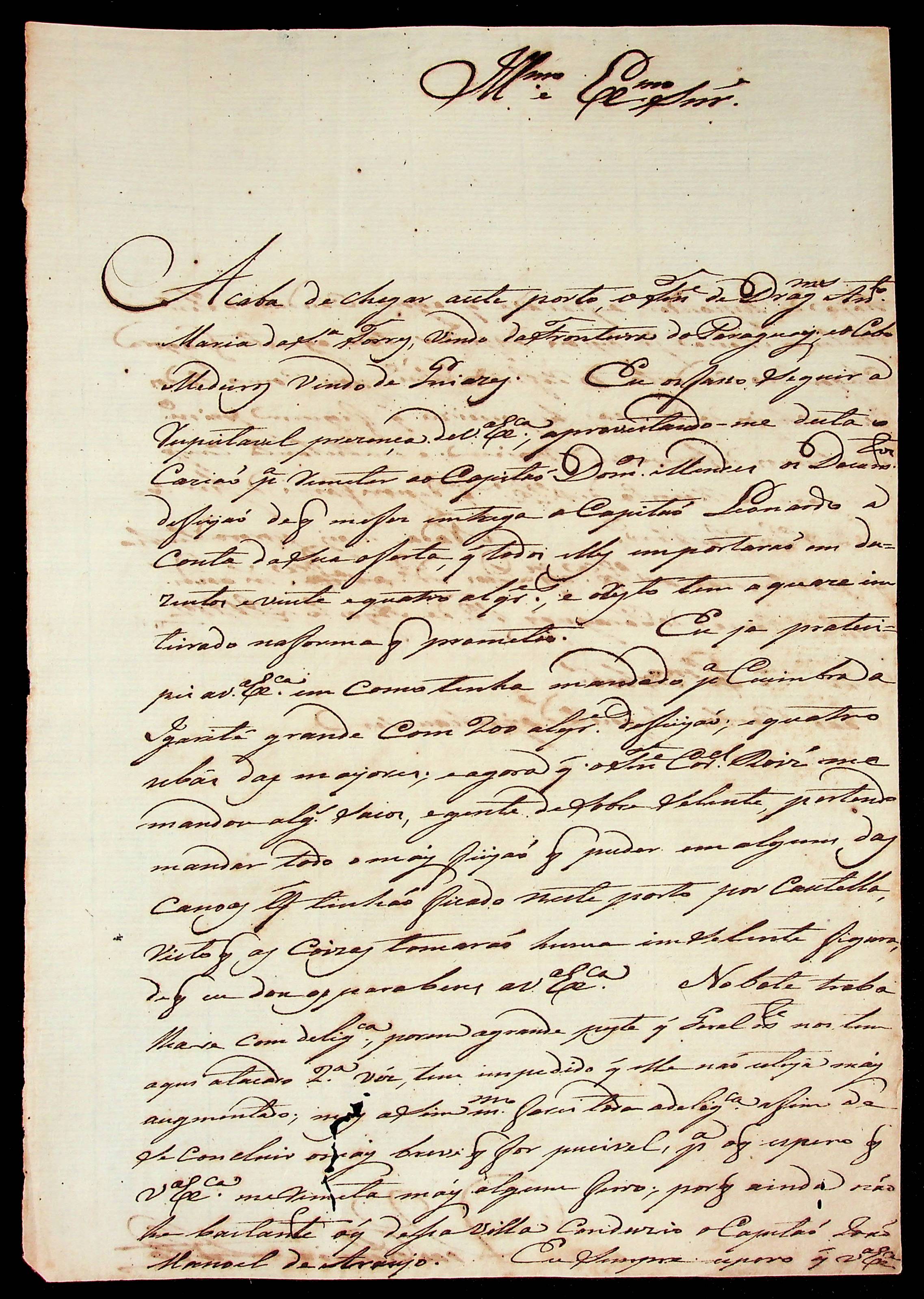 CARTA do [Comandante de Vila Maria do Paraguai] João Pereira Leite ao [Governador e Capitão-General da Capitania de Mato Grosso] João Carlos Augusto d’Oeynhausen e Gravenberg.