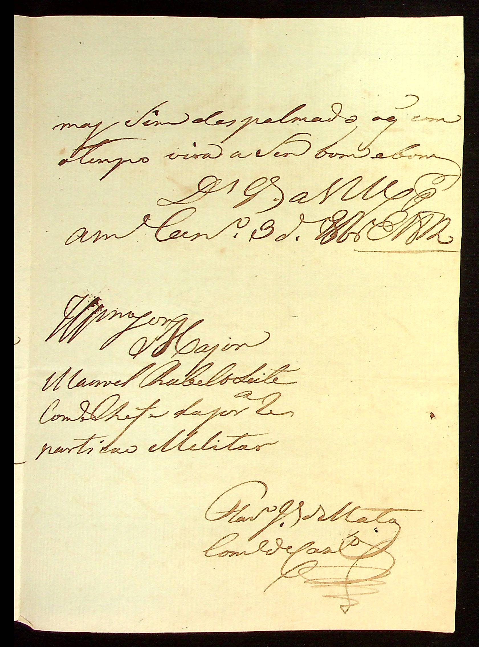 CARTA do [Comandante de Casalvasco] Flaviano José de Matos Coelho ao Major Comandante Chefe da 1ª Repartição Militar Manoel Rabelo Leite.