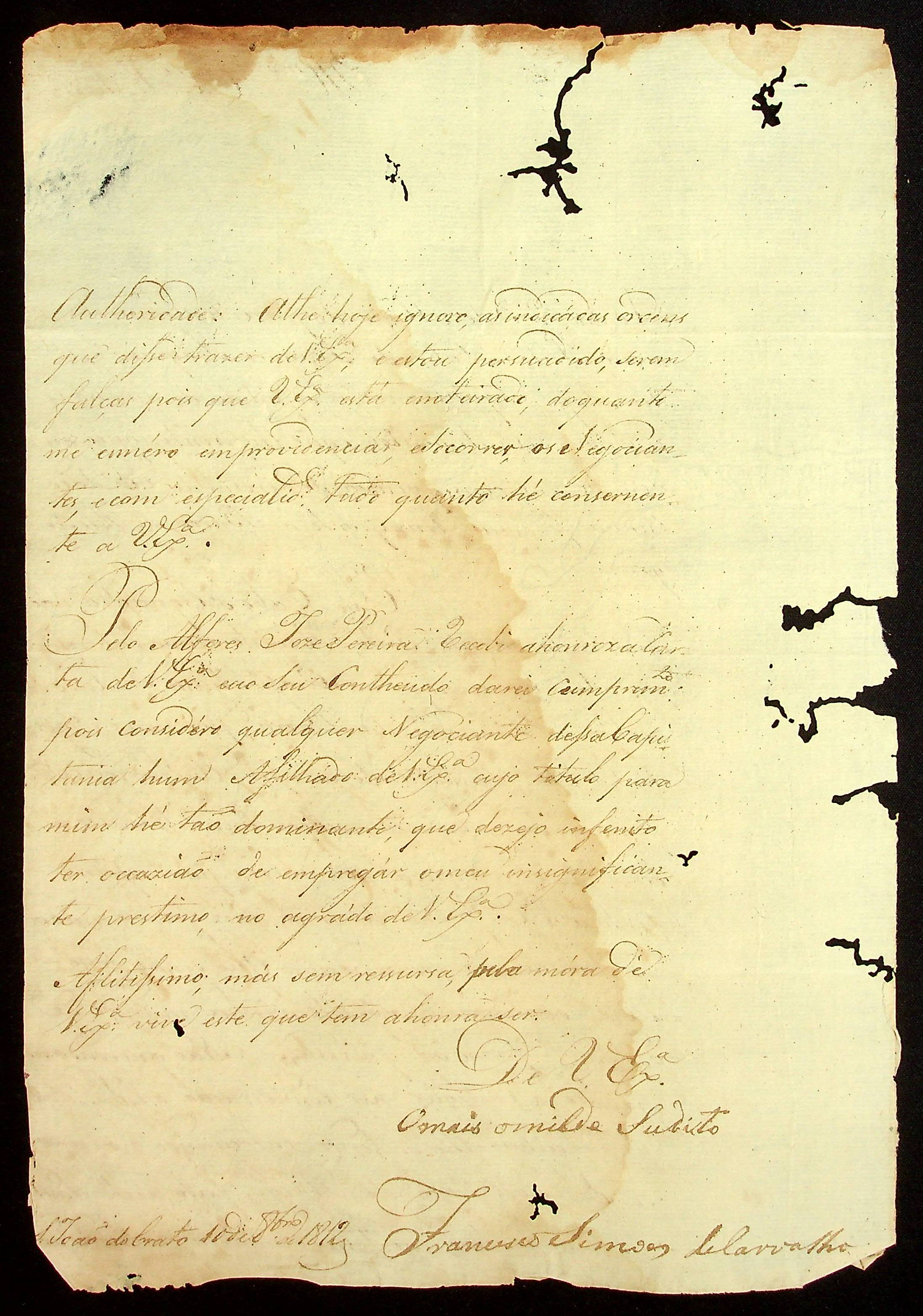 CARTA de Francisco [Simões] de Carvalho ao [Governador e Capitão-General da Capitania de Mato Grosso] João Carlos Augusto d’Oeynhausen e Gravenberg.