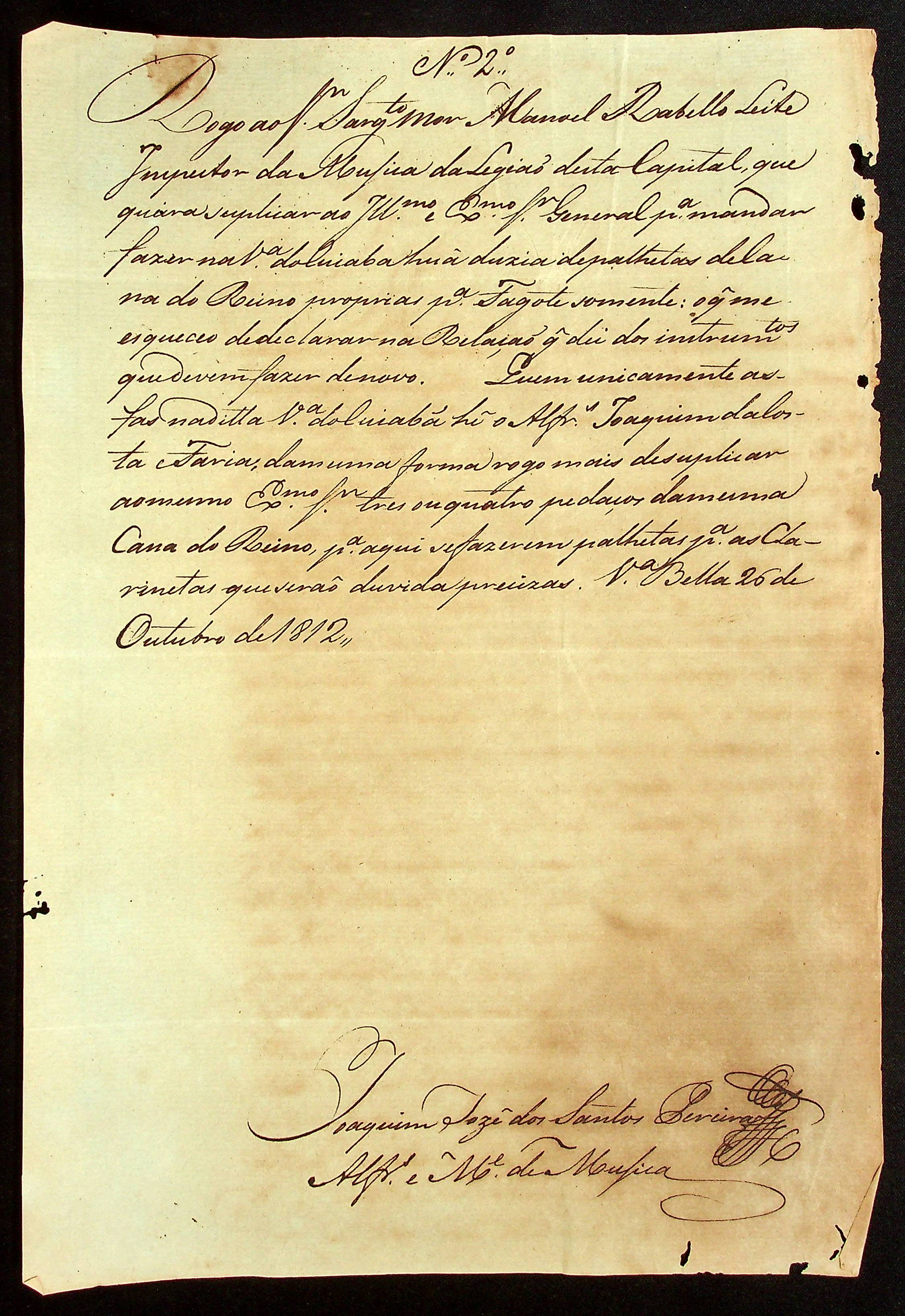 CARTA do Alferes e Mestre de Música Joaquim José dos Santos Pereira ao Sargento-mor e Inspetor de Música da Legião Manoel [Rabelo] Leite.