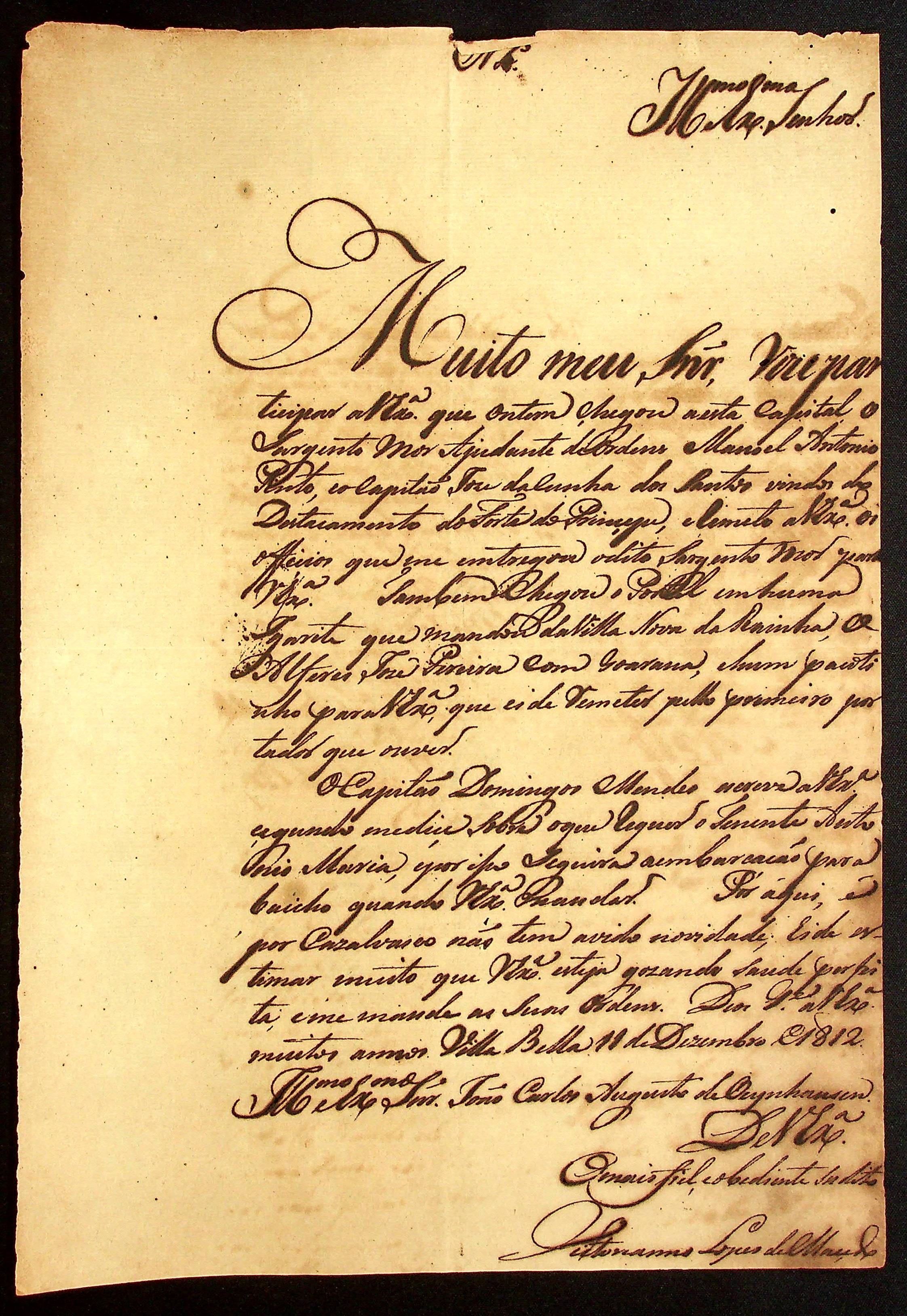 CARTA de Vitoriano Lopes de Macedo ao [Governador e Capitão-General da Capitania de Mato Grosso] João Carlos Augusto d’Oeynhausen e Gravenberg.