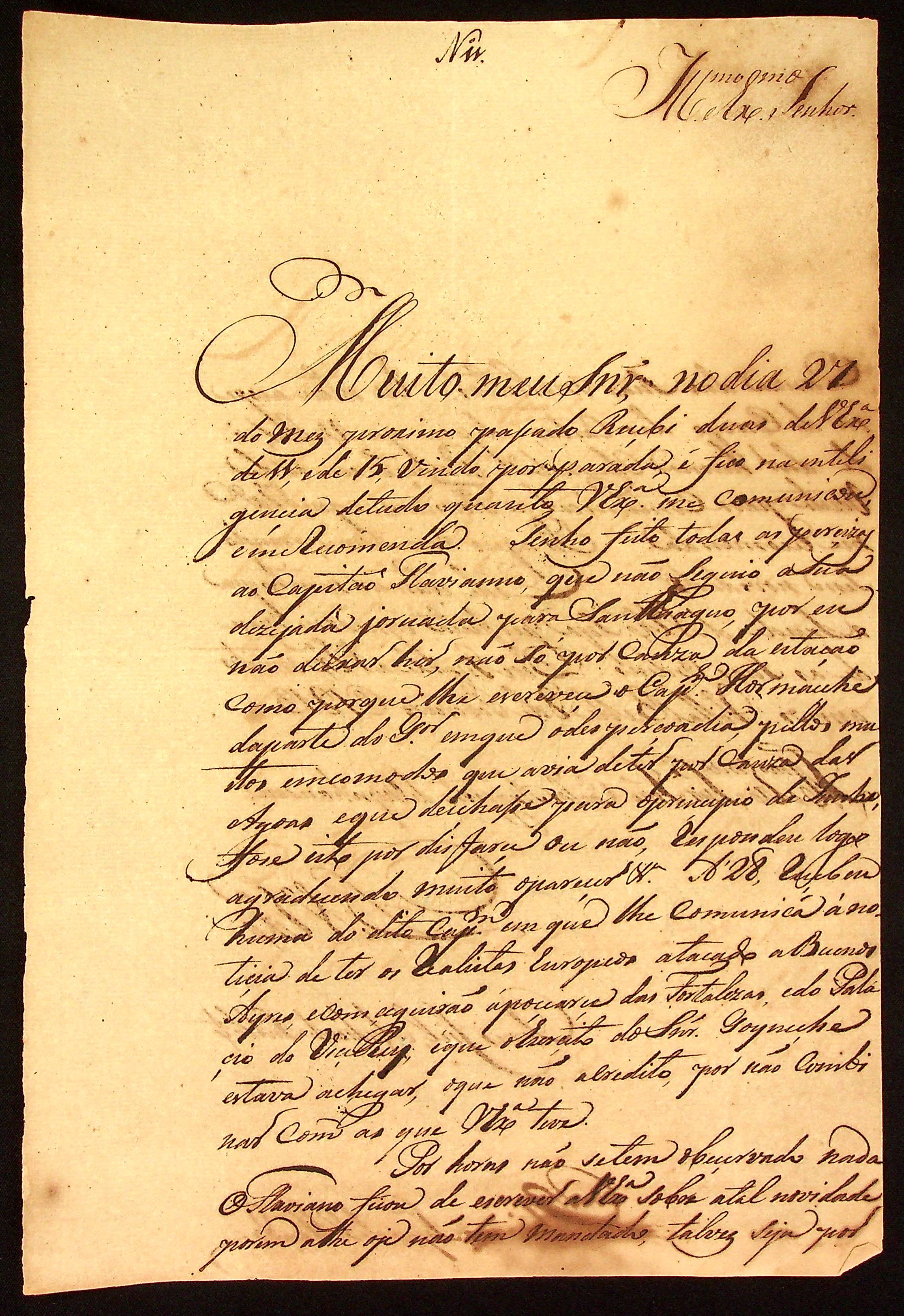 CARTA do [Comandante] Vitoriano Lopes de Macedo ao [Governador e Capitão-General da Capitania de Mato Grosso] João Carlos Augusto d’Oeynhausen e Gravenberg.