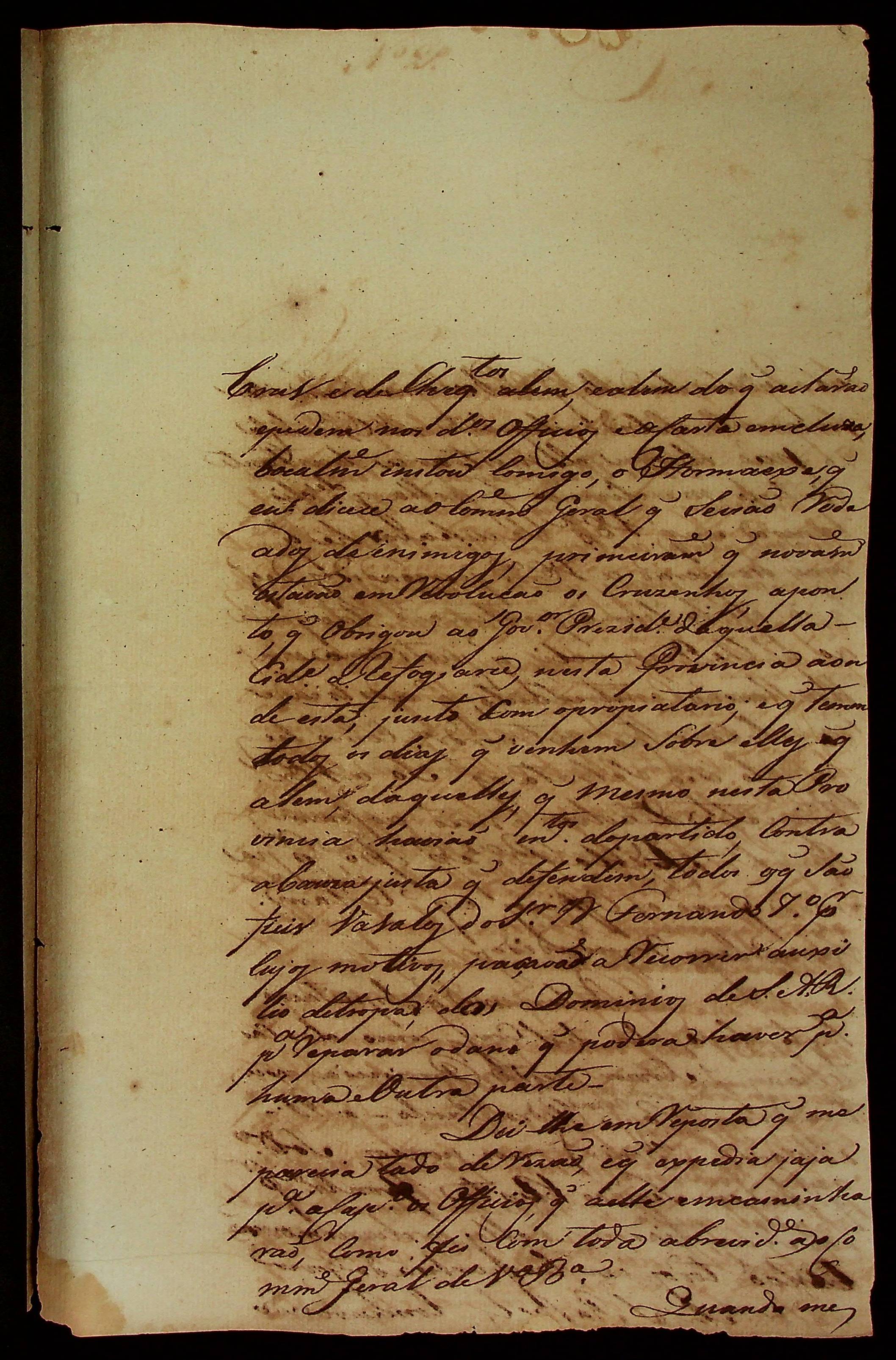 CARTA do [Comandante] Flaviano José de Matos Coelho ao [Governador e Capitão-General da Capitania de Mato Grosso] João Carlos Augusto d’Oeynhausen e Gravenberg.