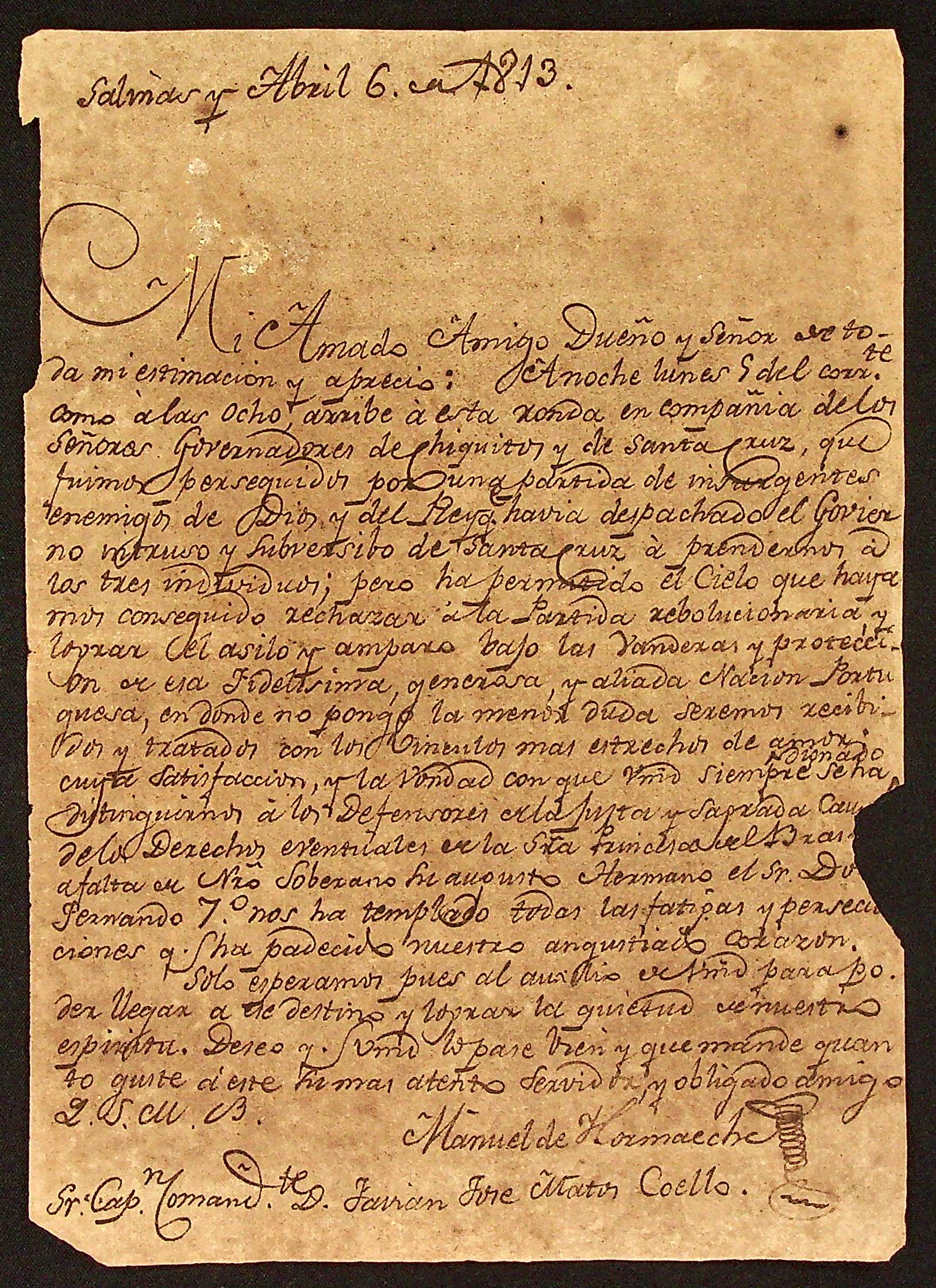 CARTA de [Manuel de Hormaeche?] ao Capitão Comandante Flaviano de Matos Coelho.