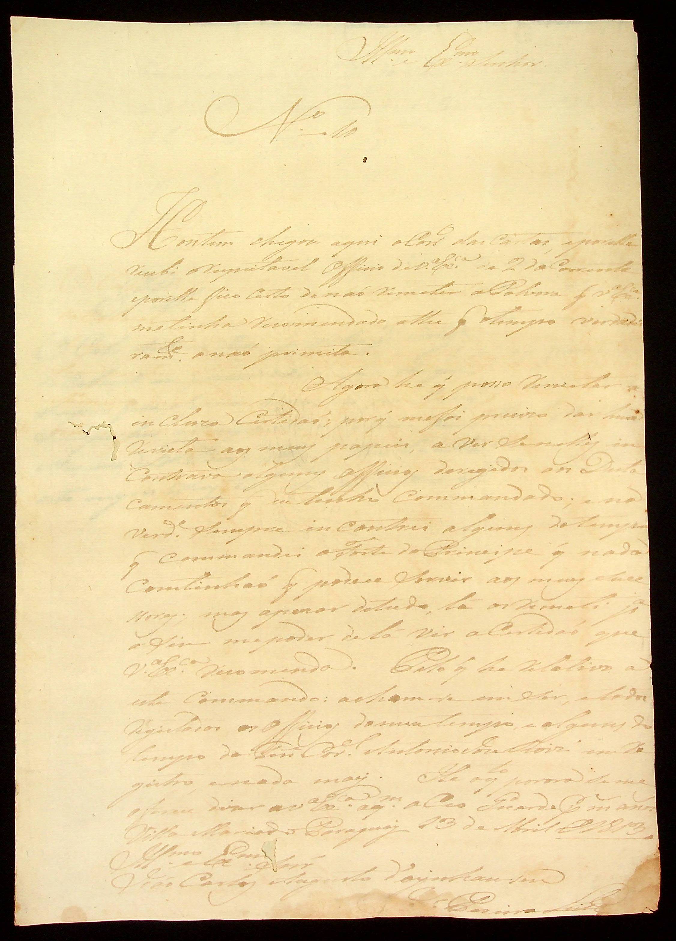 CARTA do Capitão da Companhia de Pedestres da e Comandante Geral do Alto Paraguai] João Pereira Leite ao [Governador e Capitão-General da Capitania de Mato Grosso] João Carlos Augusto d’Oeynhausen e Gravenberg.