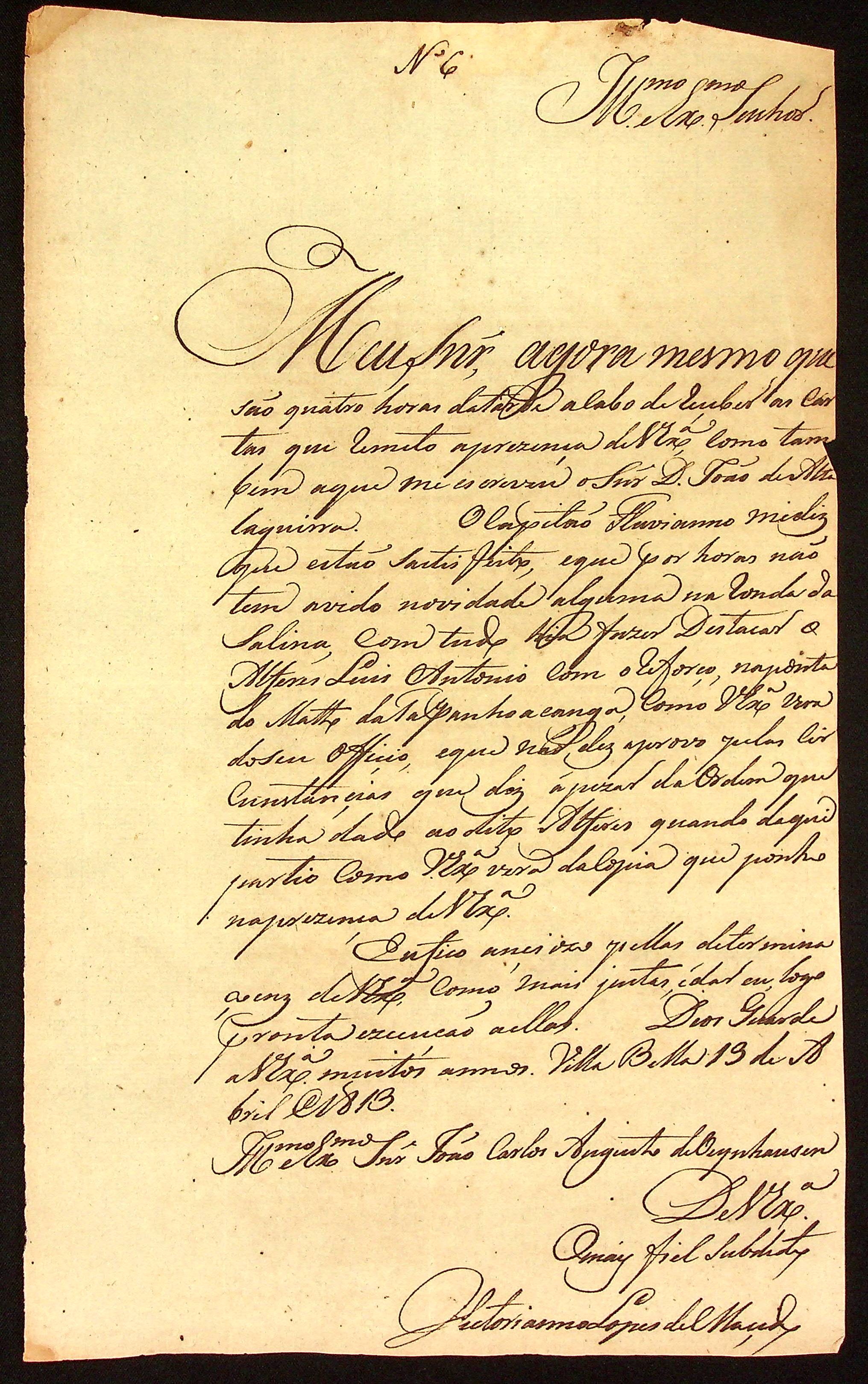 CARTA do [Comandante de Vila Bela] Vitoriano Lopes de Macedo ao [Governador e Capitão-General da Capitania de Mato Grosso] João Carlos Augusto d’Oeynhausen e Gravenberg.
