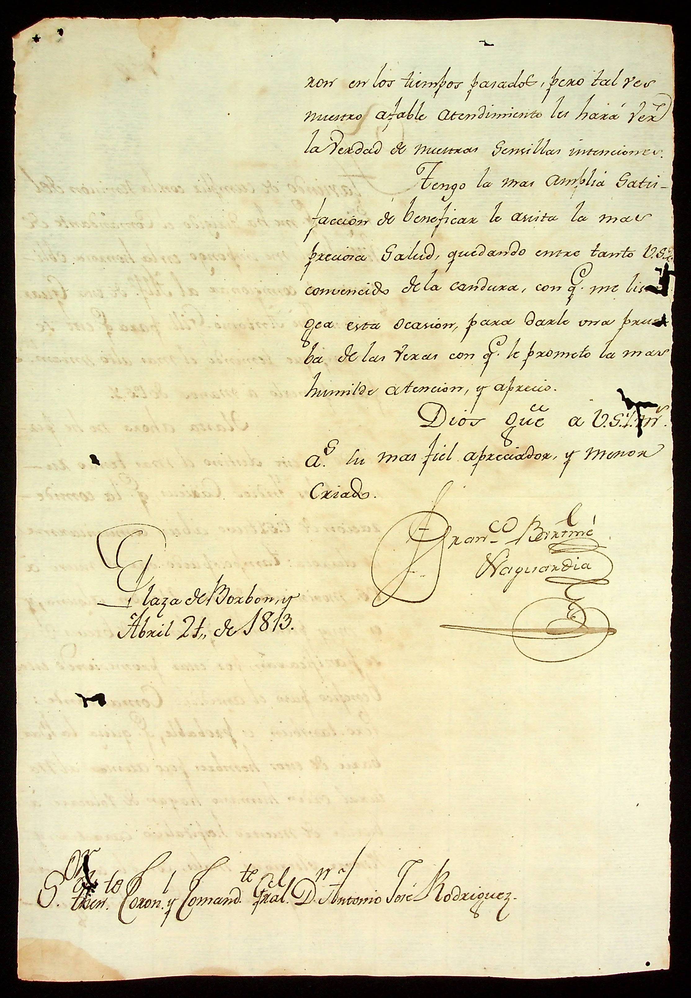 CARTA de [Francisco Bartolomeu Naguardia] ao Tenente-Coronel Comandante Geral Antônio José Rodrigues.