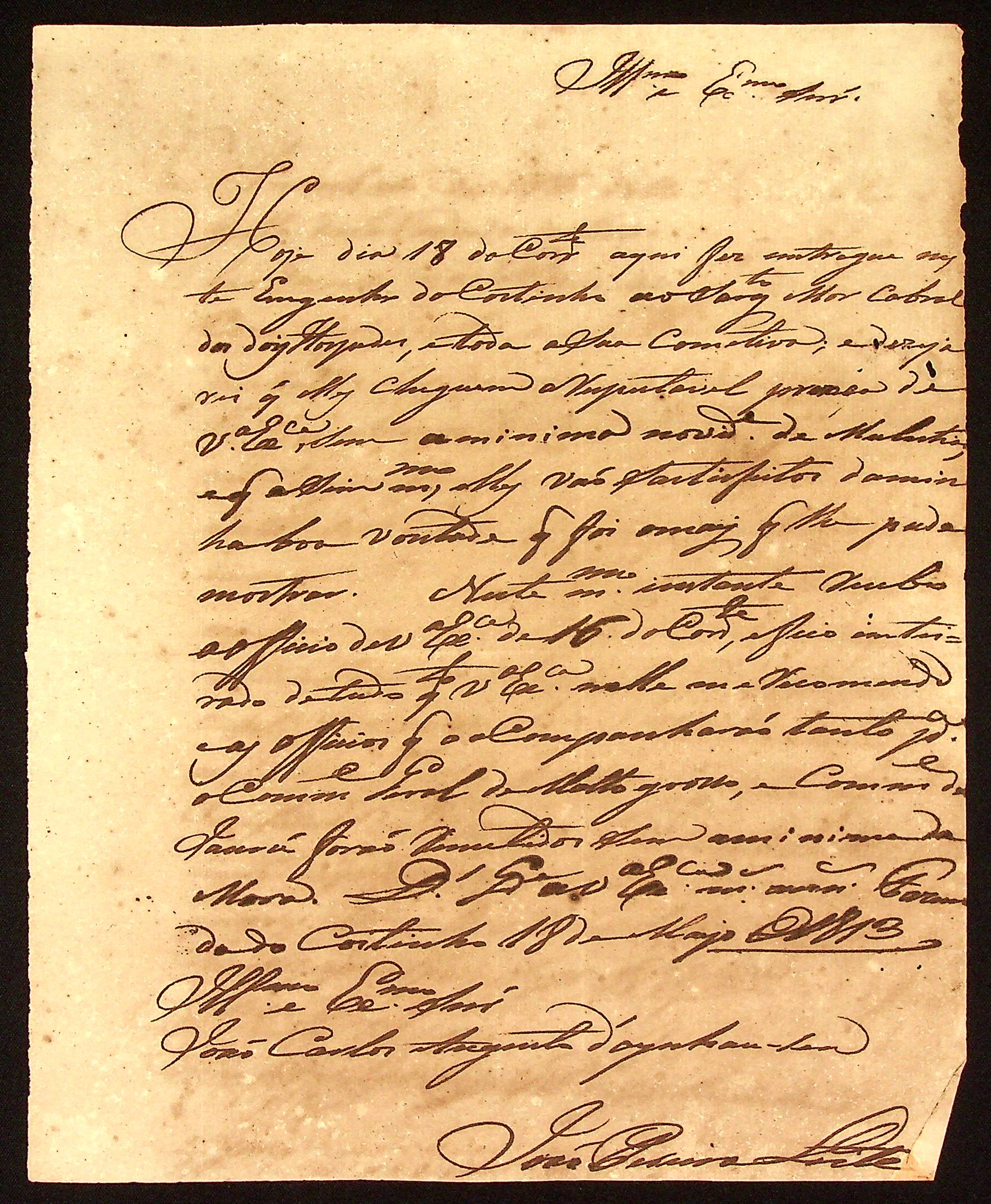 CARTA de João Pereira Leite ao [Governador e Capitão-General da Capitania de Mato Grosso] João Carlos Augusto d’Oeynhausen e Gravenberg.