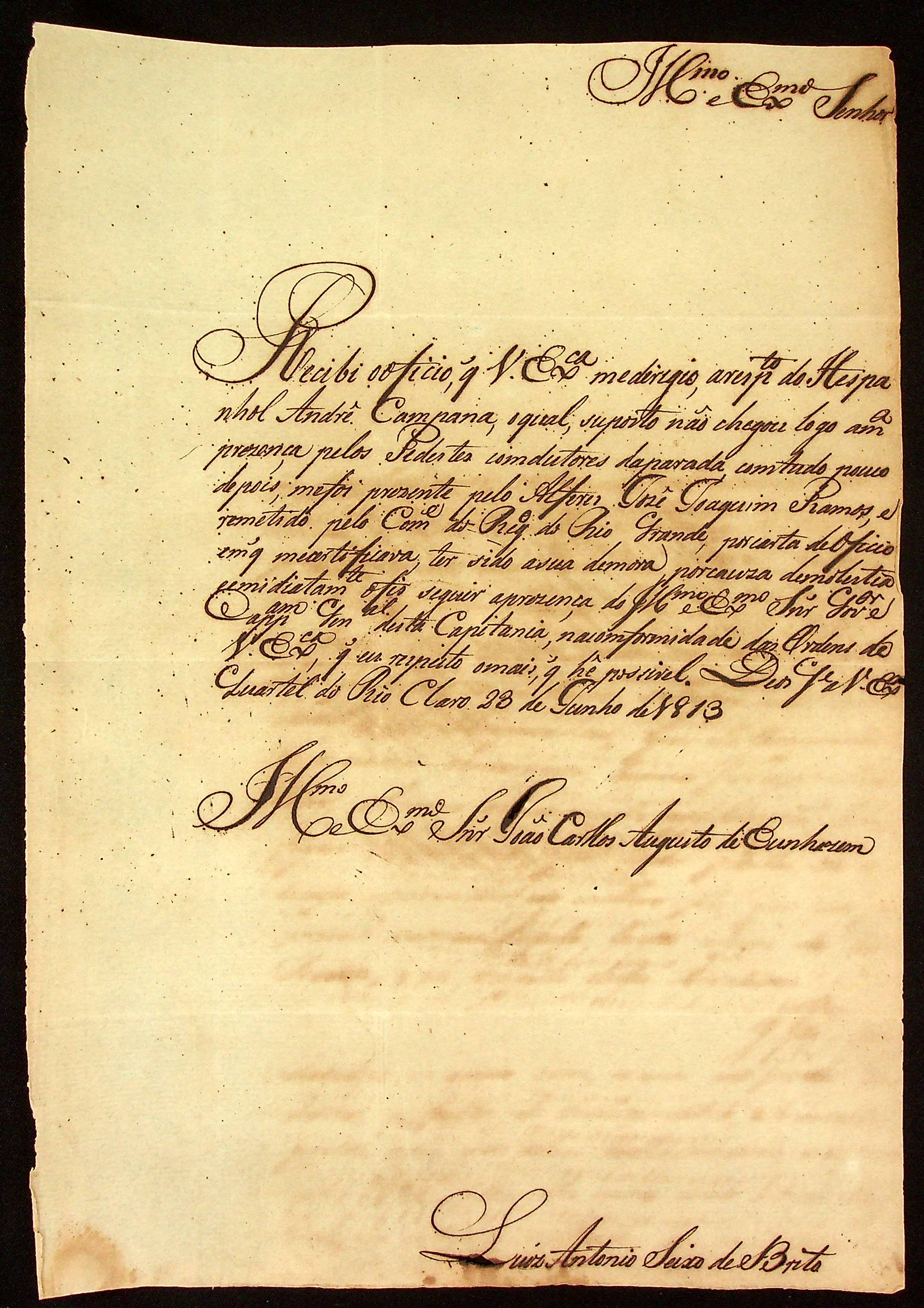 CARTA de Luís Antônio de Seixo de Brito ao [Governador e Capitão-General da Capitania de Mato Grosso] João Carlos Augusto d’Oeynhausen e Gravenberg.