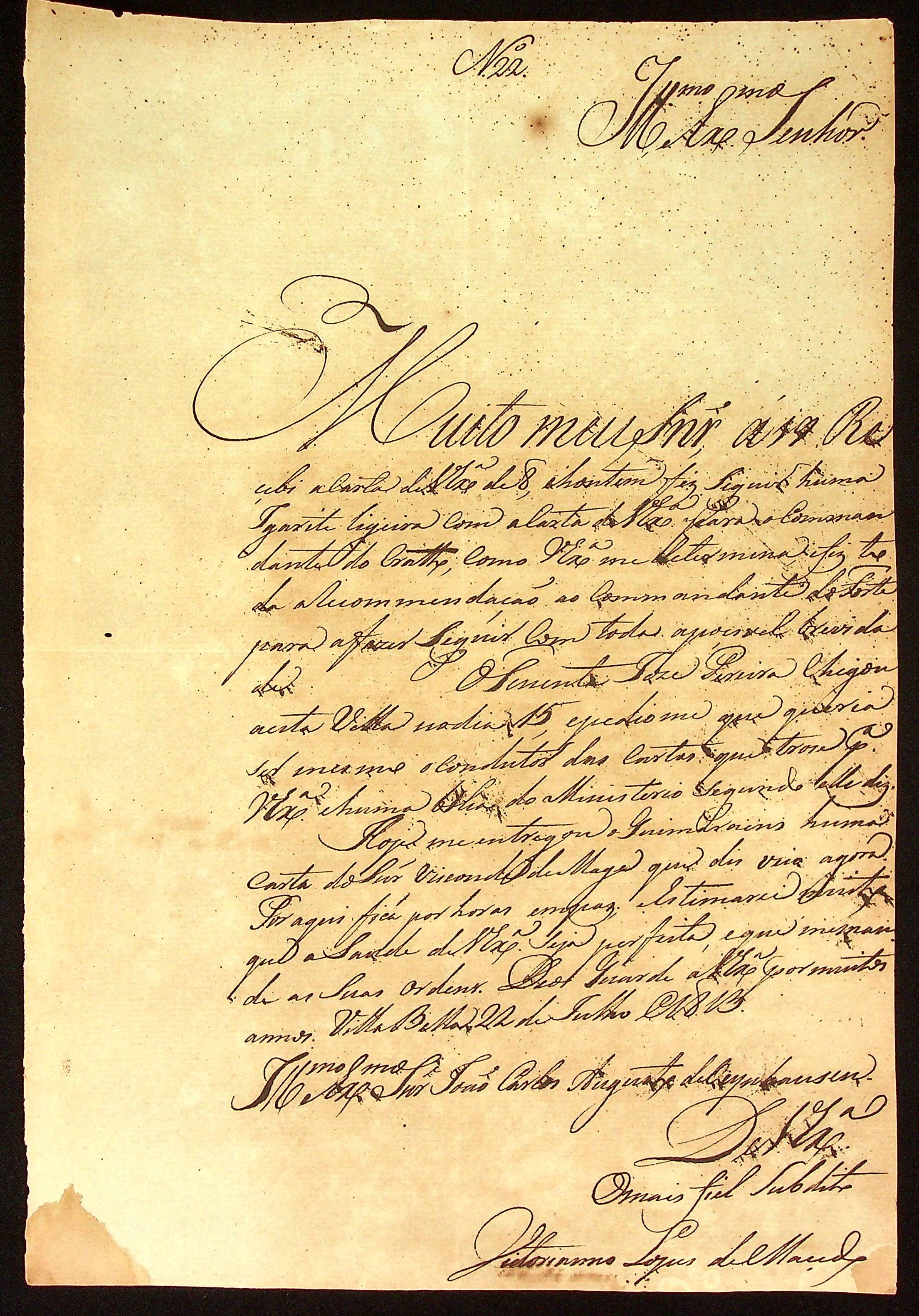 CARTA do [Tenente-Coronel] Vitoriano Lopes de Macedo ao [Governador e Capitão-General da Capitania de Mato Grosso] João Carlos Augusto d’Oeynhausen e Gravenberg.