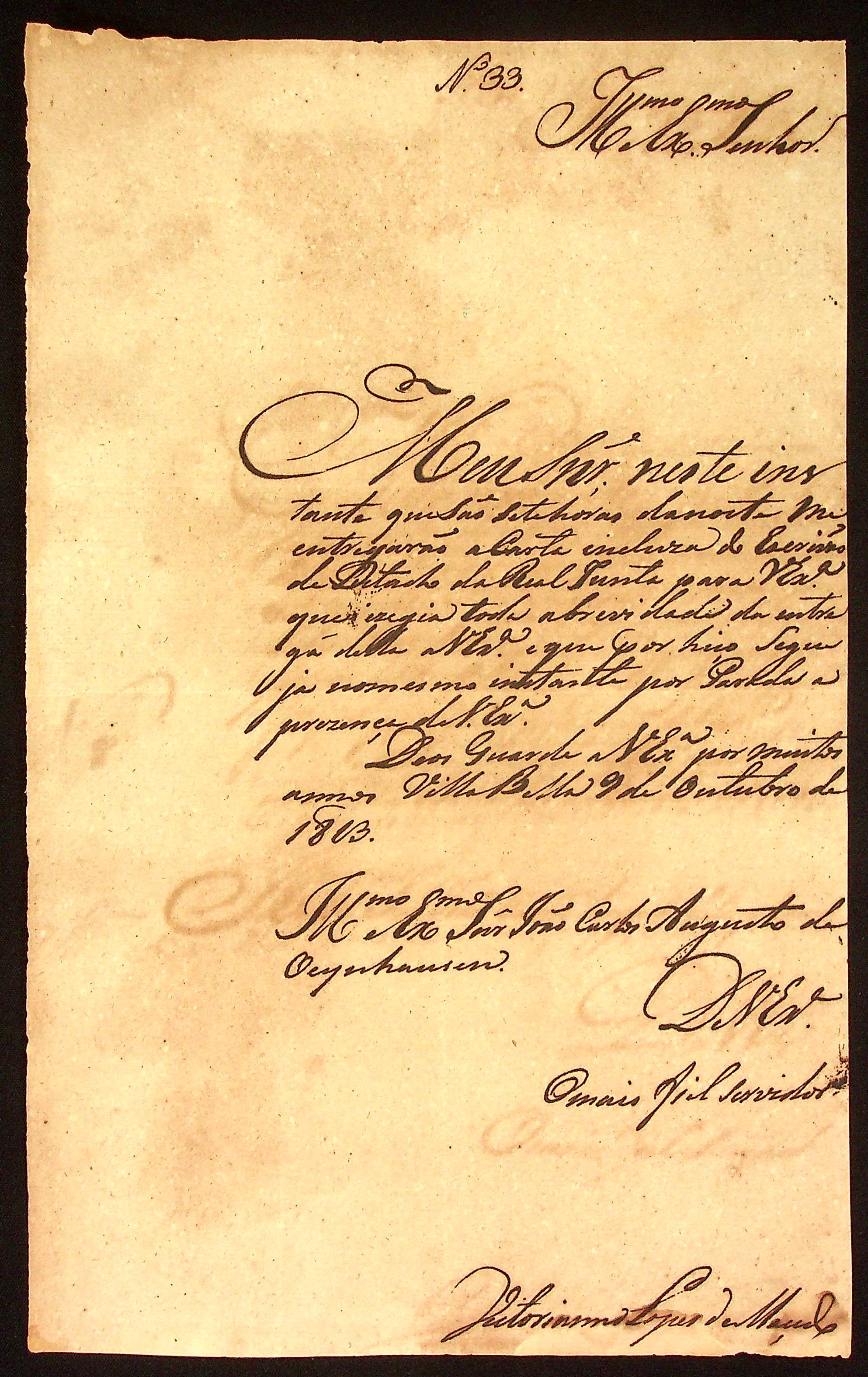CARTA do [Tenente-Coronel] Vitoriano Lopes de Macedo ao [Governador e Capitão-General da Capitania de Mato Grosso] João Carlos Augusto d’Oeynhausen e Gravenberg.