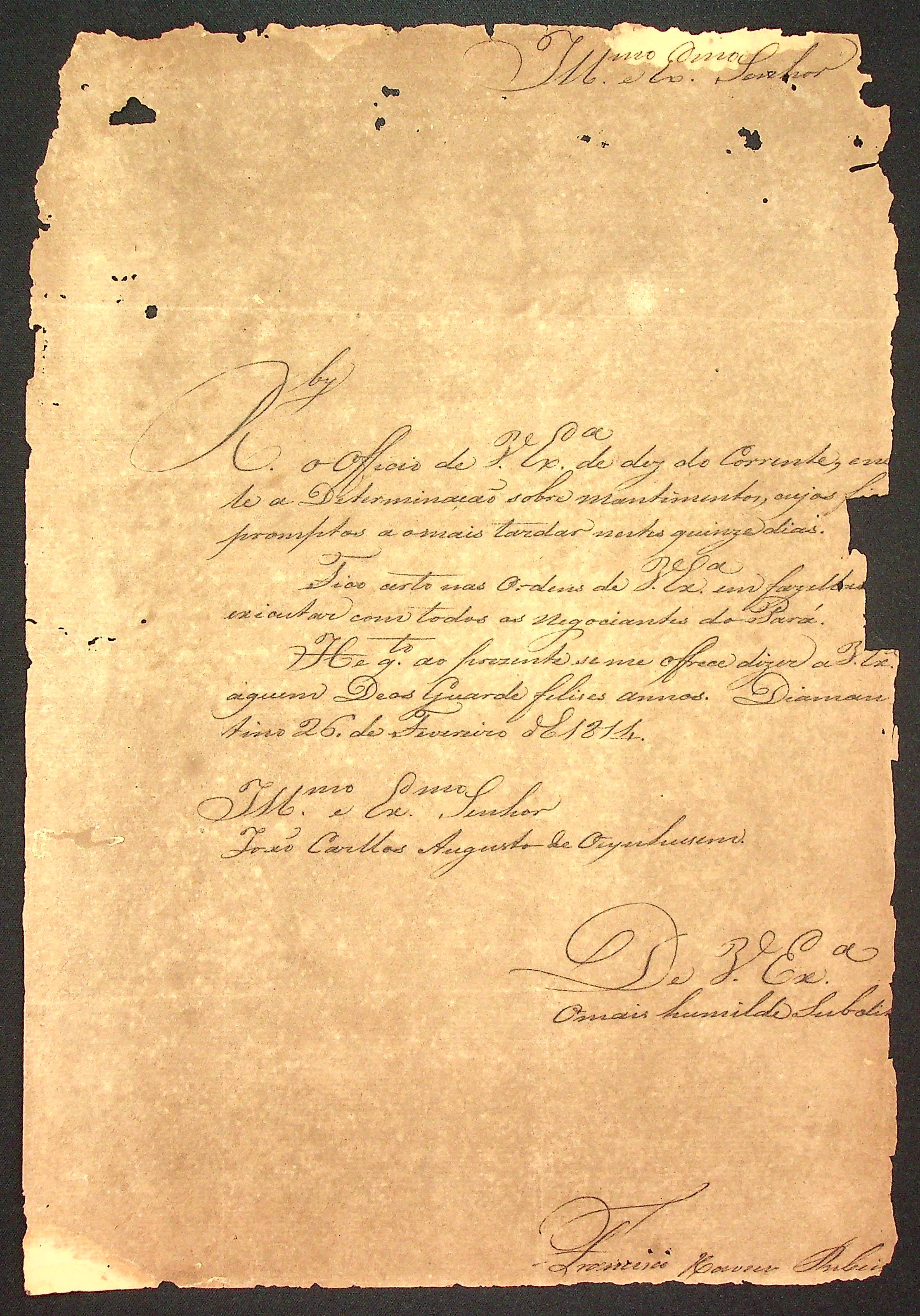 CARTA de Francisco Xavier Ribeiro ao [Governador e Capitão-General da Capitania de Mato Grosso] João Carlos Augusto d’Oeynhausen e Gravenberg.