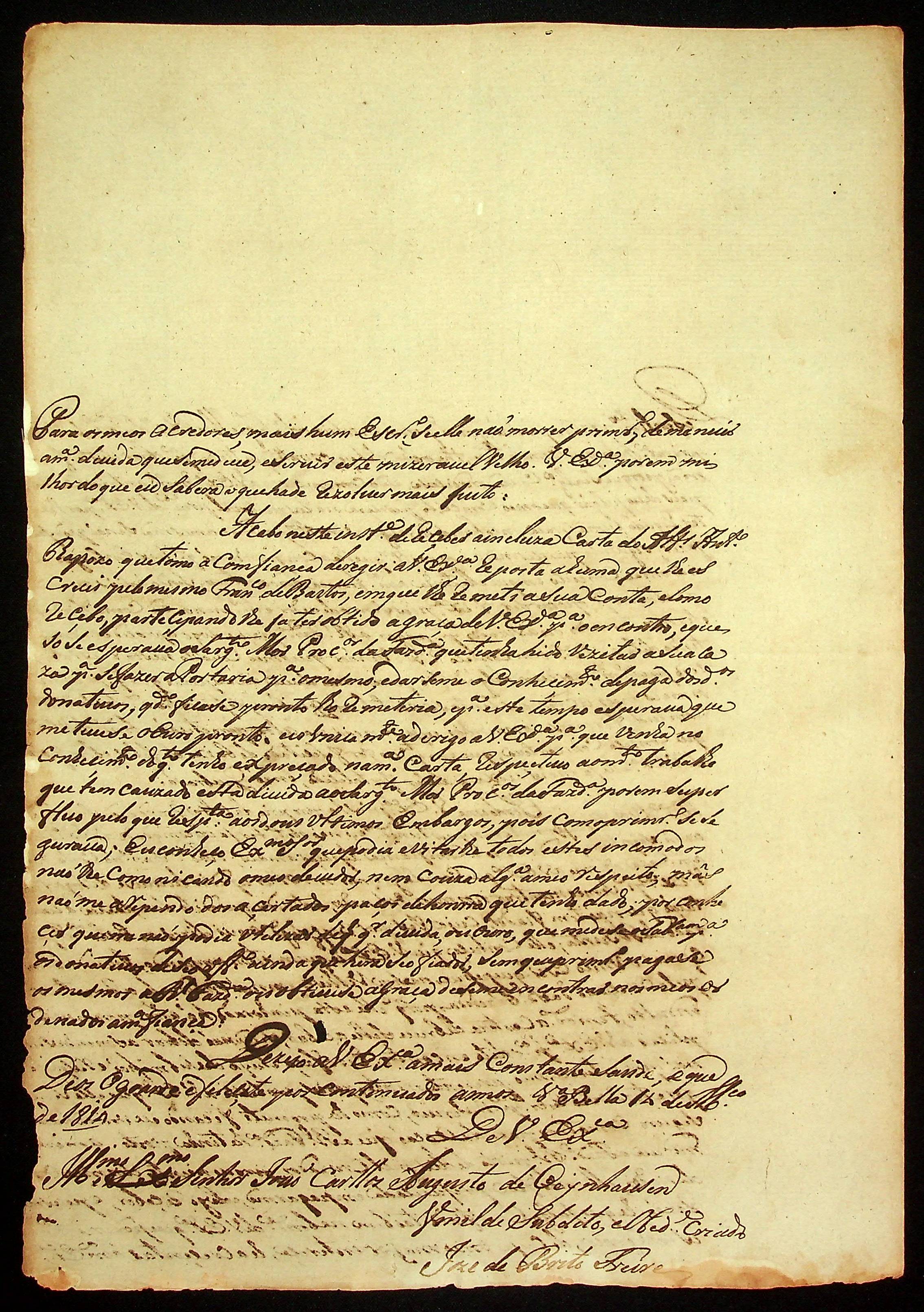 CARTA do Capitão José de Brito Freire ao [Governador e Capitão-General da Capitania de Mato Grosso] João Carlos Augusto d’Oeynhausen e Gravenberg.