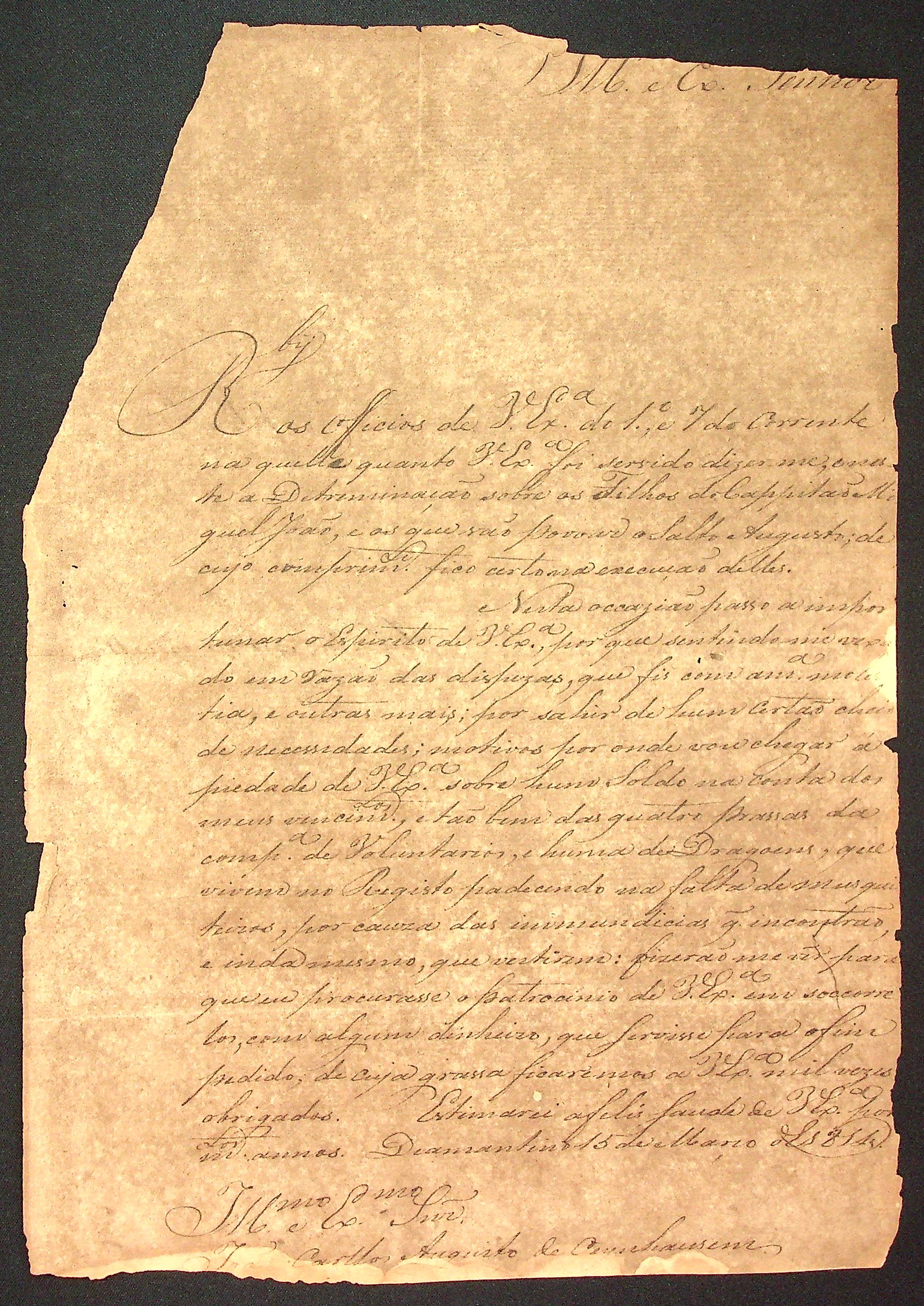 CARTA de Francisco Xavier Ribeiro ao [Governador e Capitão-General da Capitania de Mato Grosso] João Carlos Augusto d’Oeynhausen e Gravenberg.